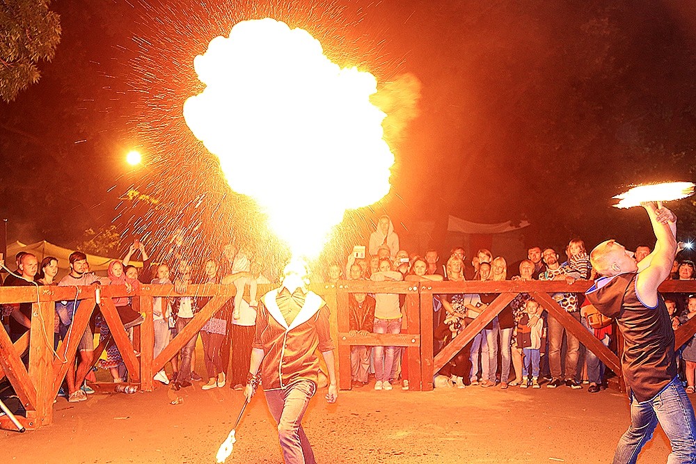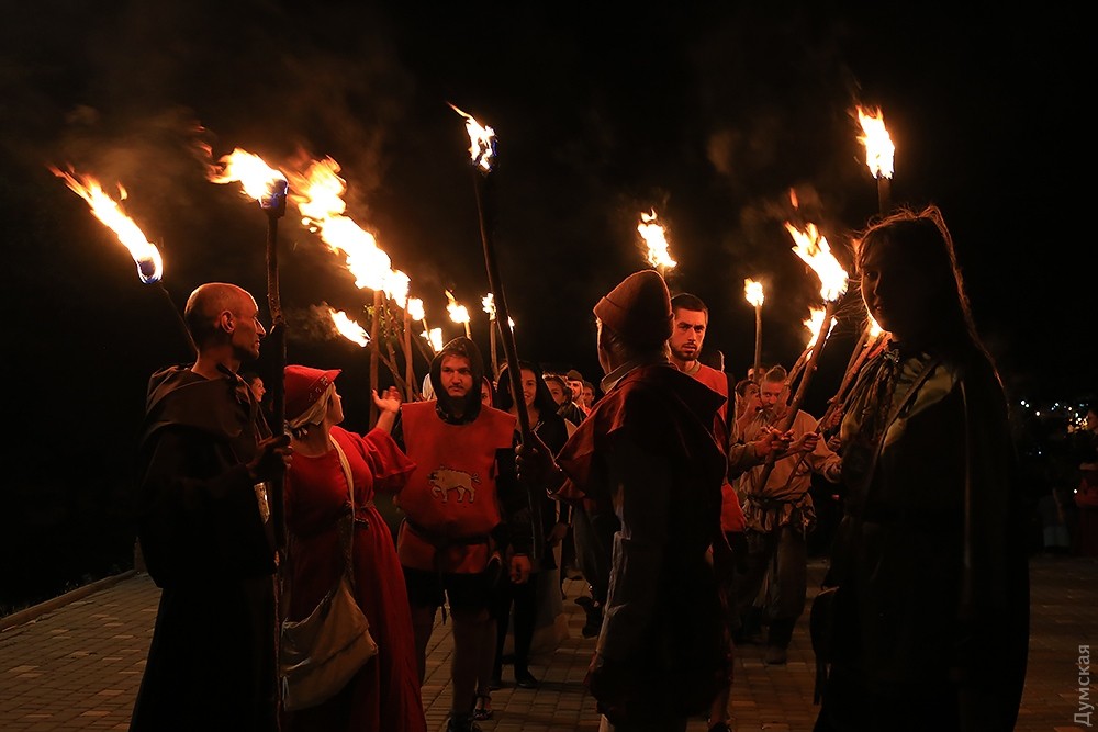 Поздно вечером состоялось факельное шествие участников мероприятия. Около 50 человек под звуки волынки с зажженными факелами прошли от Пороховой башни до ристалища и образовали огненный круг.