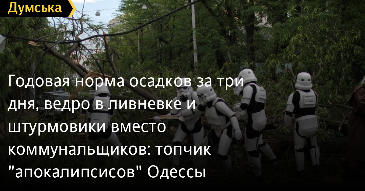 Годовая норма осадков за три дня, ведро в ливневке и штурмовики вместо коммунальщиков: топчик «апокалипсисов» ОдессыОдесситы, кажется, уже привыкли к тому, что каждый раз после удара стихии чиновники делают грустные лица и рассказывают, что были бессильны, ведь на область/город обрушилась месячная, годовая, вековая норма осадков. Мы покопались в архивах «Думской» и убедились в этом. Аномальные дожди бывают у нас с завидной регулярностью. Однако бывали и такие природные явления, которые надолго оставались в памяти. Мы собрали самые яркие «апокалипсисы» последних 15 лет. Вспоминайте вместе с нами. РЕКОРД ПОКА НЕ ПОБИТ 5 августа 2002 года в Одессе выпало наибольшее количество осадков за всю историю наблюдений — 106 мм осадков – четверть годовой нормы (30 сентября 2025 года было 94 мм). Это примерно 25 миллионов тонн воды – столько же, сколько сегодня в Куяльницком лимане. Город не только залило, но и засыпало градом. Тот ливень наделал бед. На крыше Филармонии размочило ракушняк — свалившимся на улицу куском убило маленькую девочку. На Раскидайловской обрушился балкон – вместе с двумя детьми, которые, к счастью, выжили. На Старорезничной (тогда Куйбышева) погиб 40-летний мужчина: он убирал упавшую ветку и зацепился за оголенный провод. ТРИ ДНЯ В СНЕЖНОМ ПЛЕНУ 16 декабря 2009-го в Одессе резко ухудшилась погода — пошел сильный снег, был мощный циклон. За сутки выпало около 35 мм осадков (почти месячная норма), а за три дня — около 53 мм. Дороги оказались парализованными, практически остановился общественный транспорт, хуже всего пришлось трамваям. Снегоуборочной техники было явно недостаточно. Это стало поводом для жесточайшей критики тогдашнего мэра Эдуарда Гурвица. Часть города осталось еще и обесточенной, как и сотня с лишним населенных пунктов в области. СУПЕРУРАГАН: 1000 ДЕРЕВЬЕВ ЗА 20 МИНУТ 31 мая 2013-го. Ураган повалил более 1000 деревьев, обесточил сотни домов. Пострадали три человека, один мужчина погиб. Пять улиц – Леонтовича, Каманина, Говорова, Бреуса и Люстдорфская дорога в направлении центра — были заблокированы. Последствия ликвидировали еще несколько дней, причем практически всем городом. Коммунальщикам помогали строители и даже штурмовики Дарта Вейдера. Мэром тогда был человек-кувалда Алексей Костусев. НАВОДНЕНИЕ В БЕССАРАБИИ В том же 2013-м, но чуть позже, в сентябре, произошло наводнение в Бессарабии. За три дня здесь выпала годовая норма осадков – 300 миллиметров. В итоге оказались затопленными Арцизский, Тарутинский, Саратский и Татарбунарский районы. Мощный поток размыл дороги, мосты, железнодорожные пути, дамбу. Около сотни семей остались без крыши над головой.