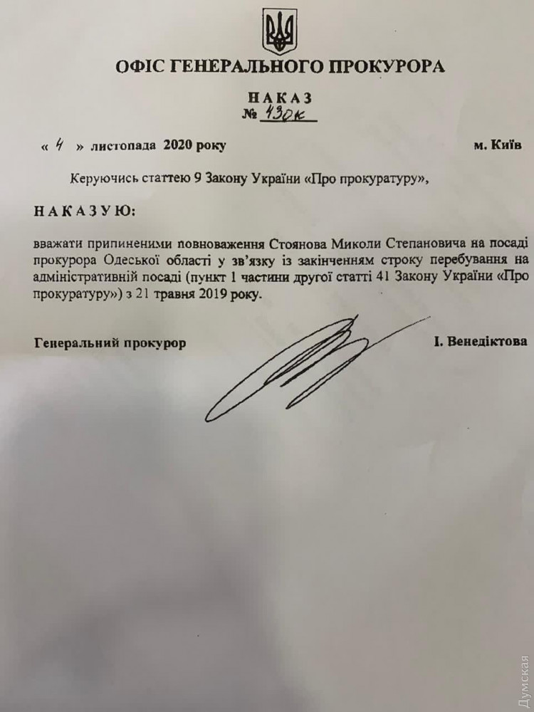 Венедиктова задним числом уволила восстановленного в должности прокурора Одесской области (документ)Генеральный прокурор Украины Ирина Венедиктова уволила с несуществующей уже должности прокурора Одесской области Николая Стоянова, которого сама же и восстановила на ней, выполняя решение суда. Сделала она это задним числом: «Считать прекращенными полномочия Стоянова Николая Степановича на должности прокурора Одесской области в связи с завершением срока пребывания на административной должности с 21 мая 2019 года», — отмечается в приказе генпрокурора. Пятый апелляционный административный суд еще в августе признал незаконным и отменил приказ и.о. генпрокурора Юрия Севрука от 15 апреля 2016 года, который уволил Стоянова в соответствии с Законом Украины «Об очищении власти». Постановление вступило в силу, по нему было открыто исполнительное производство. Правда, должности, на которой восстановили Стоянова, уже не существует, как и самой «прокуратуры Одесской области». Сейчас этот орган называется «Одесская областная прокуратура», а возглавляет ее «руководитель Одесской областной прокуратуры». Таким образом, Венедиктова выполнила судебное решение чисто формально. Напомним, Николай Стоянов был люстрирован в связи с тем, что в период правления Виктора Януковича состоял в руководстве двух местных прокуратур — с 25 февраля 2010 по 15 июня 2011 года был зампрокурора Николаевской области, а с 15 июня 2011 по 12 февраля 2013 года работал заместителем прокурора Киевской области. СМЕРТЬ РОСІЙСЬКИМ ОКУПАНТАМ! Помітили помилку? Виділяйте слова з помилкою та натискайте control-enter