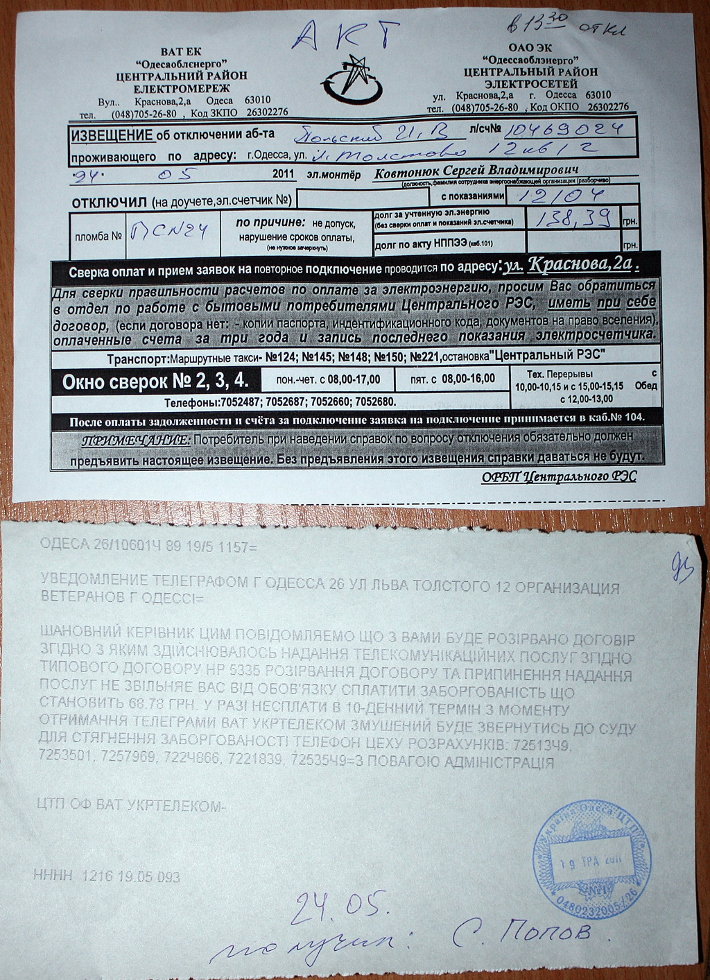 О проблемах Одесского городского совета ветеранов «Думская» писала неоднократно. В этом году ветераны впервые не получили от городских властей средства на финансирование уставной деятельности совета. И вот сегодня, 24 мая, в помещении Одесского городского совета ветеранов сотрудники «Одессаоблэнерго» отключили электроэнергию, так как организация героев войны и труда не имеет финансовой возможности заплатить по счетам.