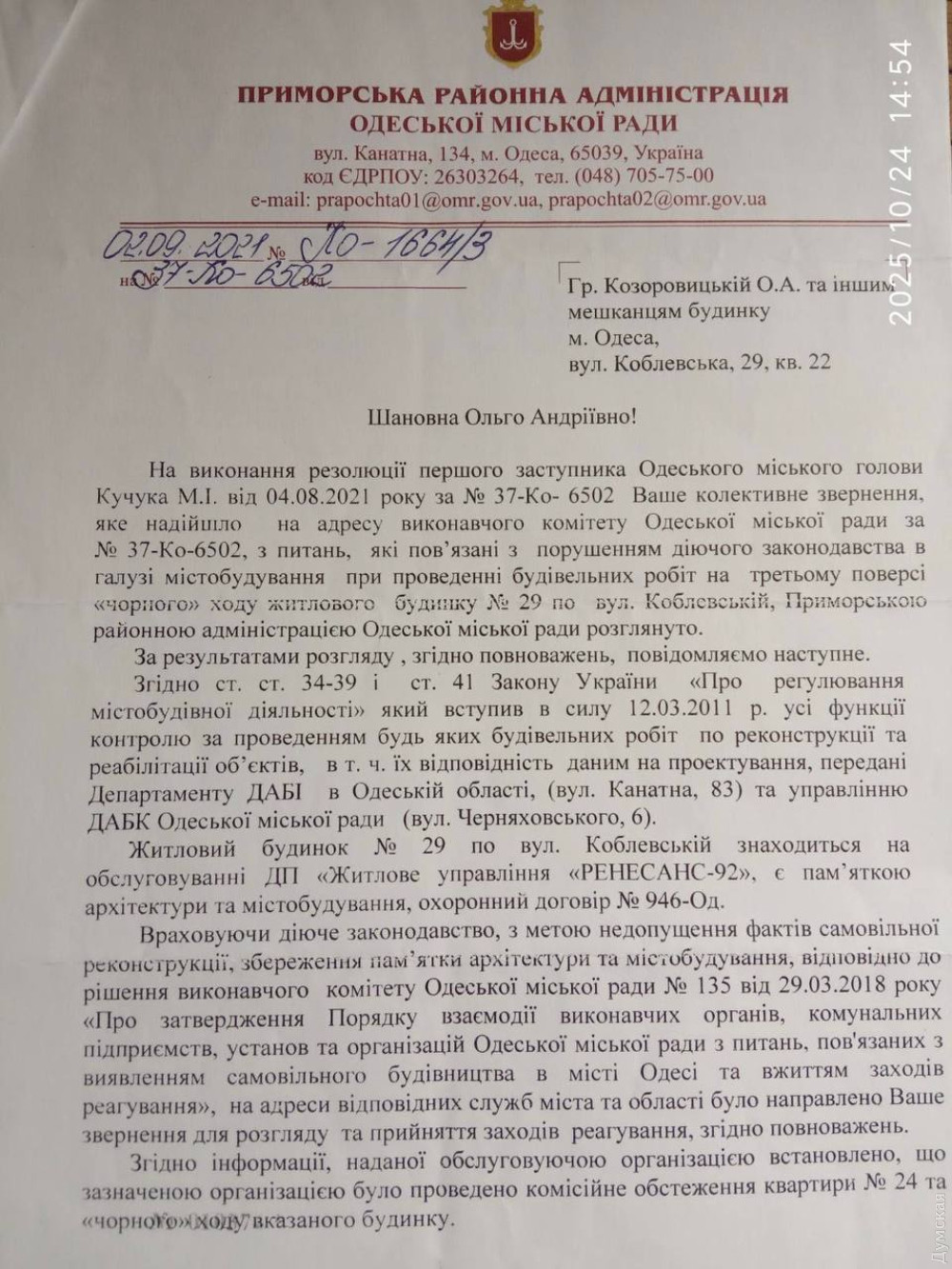 Абсурд без меж: одеський суд відмовився демонтувати незаконну ванну, яка перекрила доступ на дах будинку-пам'ятникаВ епіцентрі абсурдної ситуації опинилася одеська пам’ятка історії, архітектури та містобудування — будинок кінця XIX століття на вулиці Павла Зеленого, 29 (колишня Коблевська). Позов мешканки історичної будівлі про демонтаж самовільно збудованої її сусідами ванної кімнати суд залишив без задоволення, хоча під час розгляду з’ясувалося, що роботи проводилися з порушенням закону. Втім суд зобов’язав сплатити позивачці 40 тисяч гривень моральної шкоди. Головну вимогу — демонтувати бетонний наріст — залишили без задоволення. Як стало відомо кореспонденту «Думської», у Приморському суді сперечалися мешканка будинку Ольга Козоровицька та її сусіди з третього поверху — Юрій Сердюк і Ганна Бойченко. Конфлікт розпочався у червні 2021 року, коли Юрій, який мешкав із Ганною, попросив у позивачки дозволу лише на те, щоб вивести каналізацію через «чорний хід» — і запевнив, що завершить роботи за місяць. Замість цього пара звела ванну кімнату на великій бетонній плиті, що тепер нависає між другим і третім поверхами. Прибудову приєднали до своєї квартири. Ольга Козоровицька розповіла нам, що викликала численні інстанції: від Управління з питань охорони об’єктів культурної спадщини Одеської міськради та обслуговуючої компанії «Ренесанс» до поліції. Всі ці органи видали приписи з вимогою негайно зупинити роботи та надати дозвільну документацію для реконструкції у пам'ятці архітектури. Однак сусіди повністю проігнорували ці вимоги. Поки жінка вела листування приблизно вісім місяців, незаконне будівництво було повністю завершене. Головним наслідком стало те, що прибудова повністю перекрила «чорний хід», унеможлививши доступ на горище та дах будинку. «Зараз війна, а якщо на горище щось потрапить і треба буде гасити пожежу?», — наголошує пані Козоровицька. Вона зверталася до Управління надзвичайних ситуацій, де їй підтвердили, що всі входи до підсобних приміщень у будинку повинні бути вільними, що наразі є грубим порушенням, яке загрожує безпеці мешканців. За словами позивачки, власники квартири вбили металеві конструкції прямо у стіни її кухні та туалету, залили їх бетоном, через що стеля почала протікати. Коли жінка спробувала з’ясувати, що відбувається, Юрій заявив, що це «нова ванна кімната». У результаті над двором, який є територією школи № 75, з’явилася величезна бетонна плита — основа для прибудови. Будівельні роботи тривали майже пів року, включно з вихідними: шум, пил і перфоратори стали постійним фоном життя мешканців історичної будівлі. Позов Ольга подала ще у листопаді 2021 року. Суд розглядав справу понад п’ять років. Попри неодноразові звернення жінки до різних інстанцій, Приморська райадміністрація Одеської міськради не вжила жодних заходів. Через це позивачка просила стягнути з РА 100 тисяч гривень моральної шкоди за бездіяльність. У вересні 2021 року Департамент культури, національностей, релігій та охорони об’єктів культурної спадщини Одеської ОДА склав припис про порушення Закону України «Про охорону культурної спадщини» та вимагав припинити незаконні роботи. У своїх письмових поясненнях департамент підтвердив: відповідачі дійсно порушили закон, розпочавши ремонт без погодженої науково-проєктно