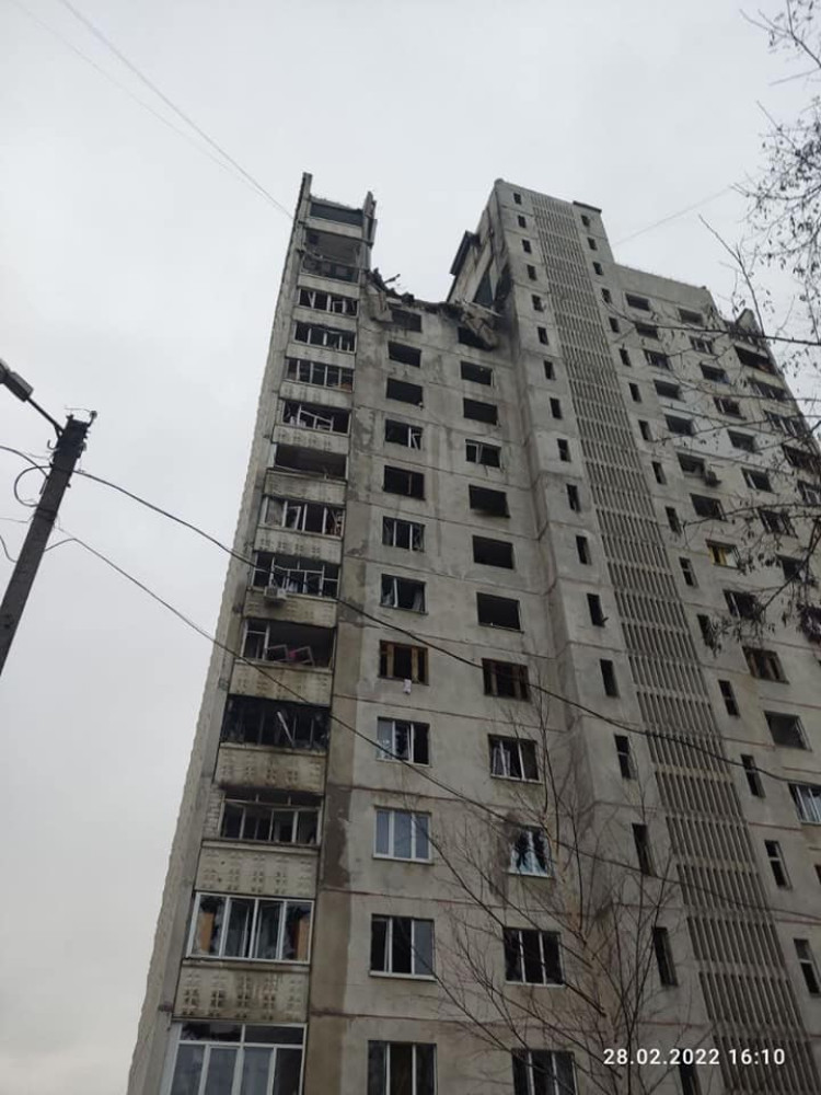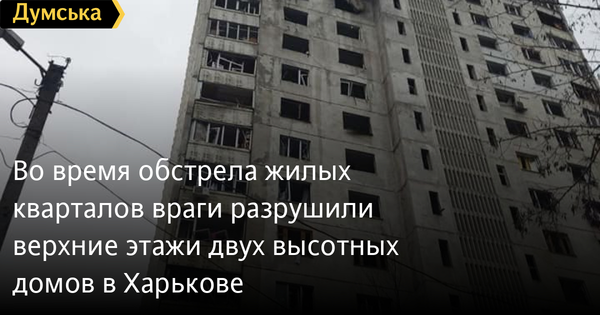 Во время обстрела жилых кварталов враги разрушили верхние этажи двух высотных домов в ХарьковеРоссийские «освободители» продолжают обстреливать жилые районы украинских городов. Днем в Харькове во время обстрелов были разрушены верхние этажи двух жилых 16-этажных домов. Об этом сообщила пресс-служба ГСЧС. «28 февраля во время обстрелов подверглись разрушениям верхние этажи 2 жилых 16-этажных домов на ул. Кольцевой. Из двух домов были эвакуированы 35 человек. 8 человек были травмированы», — отметили спасатели. К эвакуационным работам привлекалось восемь единиц пожарно-спасательной техники и 40 человек личного состава ГСЧС. СМЕРТЬ РОСІЙСЬКИМ ОКУПАНТАМ! Помітили помилку? Виділяйте слова з помилкою та натискайте control-enter |