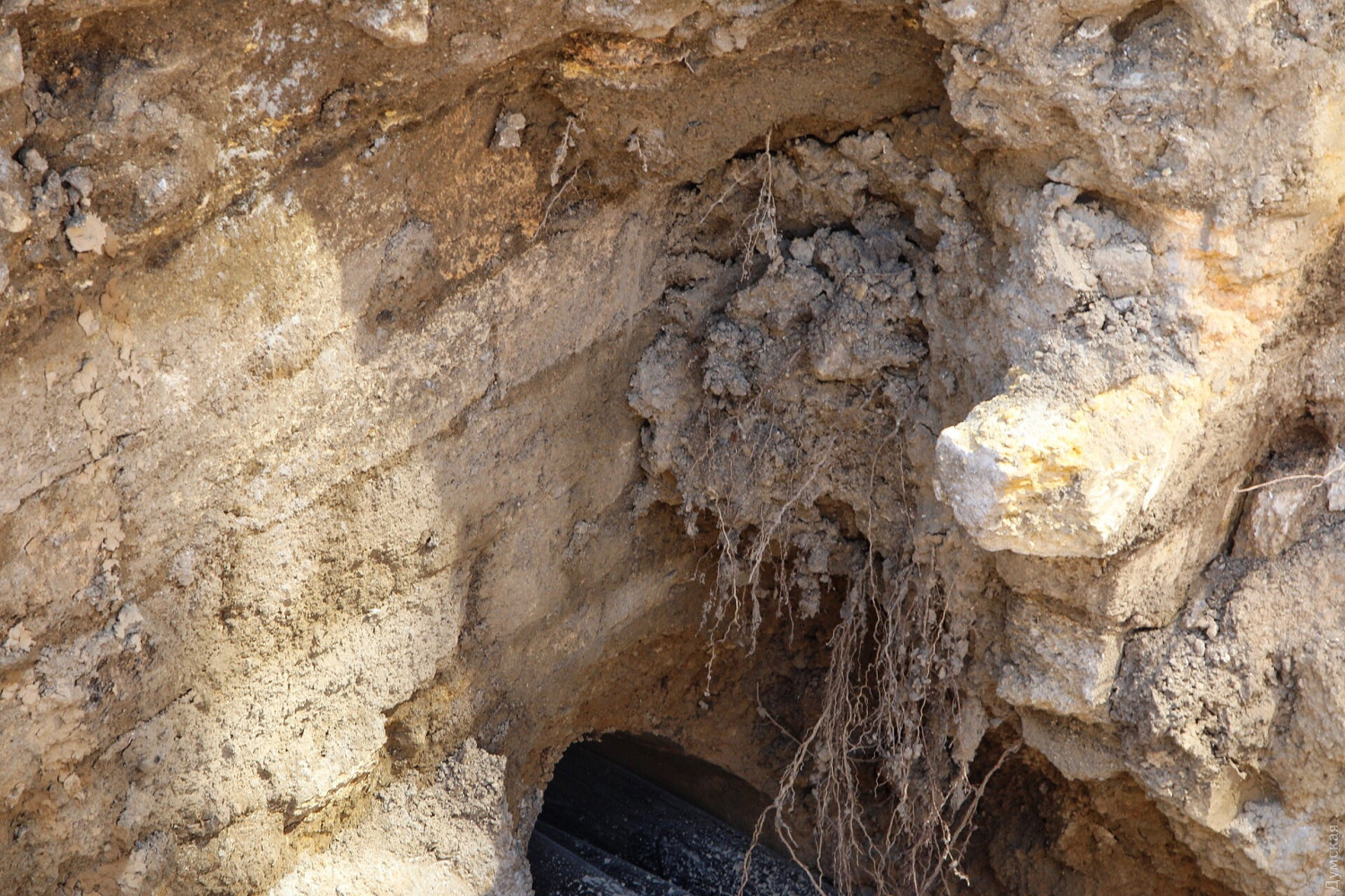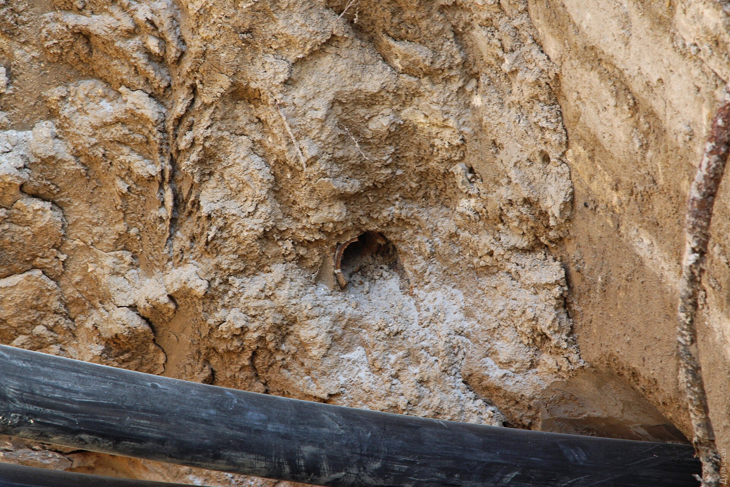 Как передает корреспондент «Думской», странная стена залегает приблизительно на полметра ниже уровня мостовой и тянется вдоль Дерибасовской.