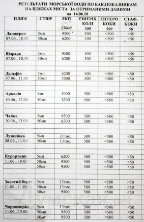 На некоторых одесских пляжах купаться вобще не стоит — море кишит болезнетворными бактериямиНаши источники в облСЭС получили последние данные результатов анализов морской воды на пляжах города. Нормы, приведенные в верхней строчке — не соответствуют действительности. На самом деле например ЛКП (лактозо-положительная кишечная палочка) не должна превышать 5000. Таким образом содержание болезнетворных микроорганизмов в морской воде превышено на всех пляжах. При этом относительно чистыми можно считать Аркадию и Дельфин. Самая плохая ситуация — на Лузановке, Золотом Берегу и Черноморке. Там купаться действительно не стоит. СМЕРТЬ РОСІЙСЬКИМ ОКУПАНТАМ! Помітили помилку? Виділяйте слова з помилкою та натискайте control-enter |