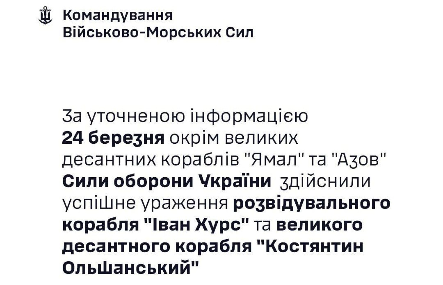 Військово-морські сили України вразили «Нептуном» великий десантний корабель, захоплений росіянами ще 2014 рокуВеликий десантний корабель ВМС України «Костянтин Ольшанський», захоплений російськими окупантами ще 2014 року, вразили Сили оборони, використавши протикорабельну ракету «Нептун». Про це в ефірі телеканалу FREEДОМ повідомив пресофіцер національного флоту капітан 3 рангу Дмитро Плетенчук. За його словами, навколо БДК розгорнулася ціла детективна історія. Дев'ять років «Ольшанський» стояв у Севастопольській бухті, де його потихеньку розбирали на частини. «Просто банально грабували, — зазначив офіцер. — А на десятий рік війни вони зрозуміли, що в них закінчуються великі десантні кораблі цього проєкту 775 і вирішили його відновити. Протягом року його докували, провели відновлювальні роботи. Але метою цих робіт, як ми розуміємо, було зробити фальсифікацію, щоб відрапортувати московському керівництву і тим самим споживачам інформації, які нічого не розуміють, у Росії та на окупованих територіях про те, як вони відновили один зі своїх великих десантних, які раніше були пошкоджені. Це міг бути або «Минск», або «Оленегорский горняк», чиє відновлення під великим питанням. Відповідно, була така ідея — видати за один із них наш корабель. Тобто цей корабель мав використовуватися проти України». У зв'язку з цим командування ухвалило рішення про удар по «Ольшанському», що й було зроблено. «Він зазнав пошкоджень і наразі не в стані боєготовності», — резюмував Дмитро Плетенчук. ОНОВЛЕНО О 10:43. ВМС України офіційно підтвердили, що 24 березня Сили оборони вразили російські десантні кораблі «Ямал» і «Азов», захоплений БДК «Костянтин Ольшанський» і розвідувальний корабель «Іван Хурс». СМЕРТЬ РОСІЙСЬКИМ ОКУПАНТАМ! Помітили помилку? Виділяйте слова з помилкою та натискайте control-enter |