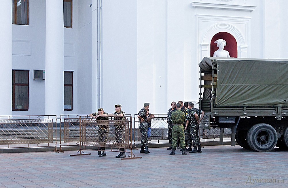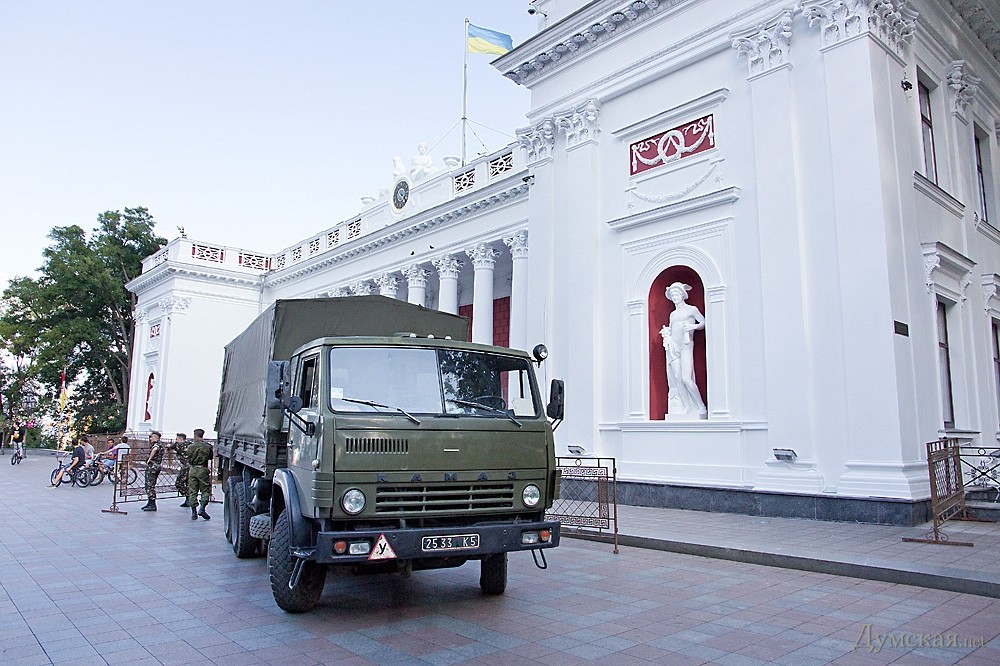 Сегодня одесситов смутил военный КаМАз и группа военнослужащих возле мэрии. Как удалось установить «Думской», городские власти поделились с людьми в погонах турникетами, которые обычно мешают возмущенной общественности линчевать люстрировать нерадивых чиновников.