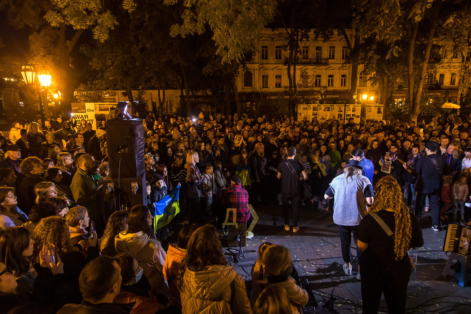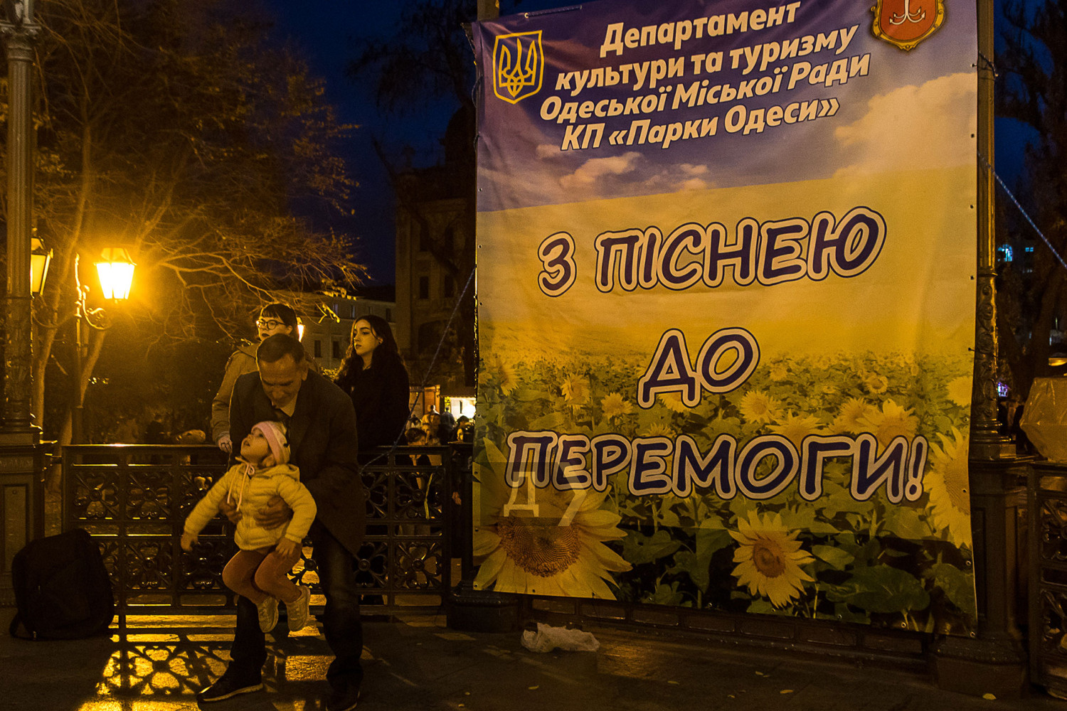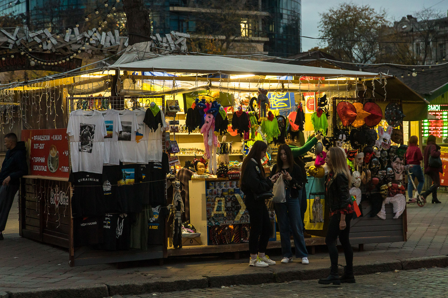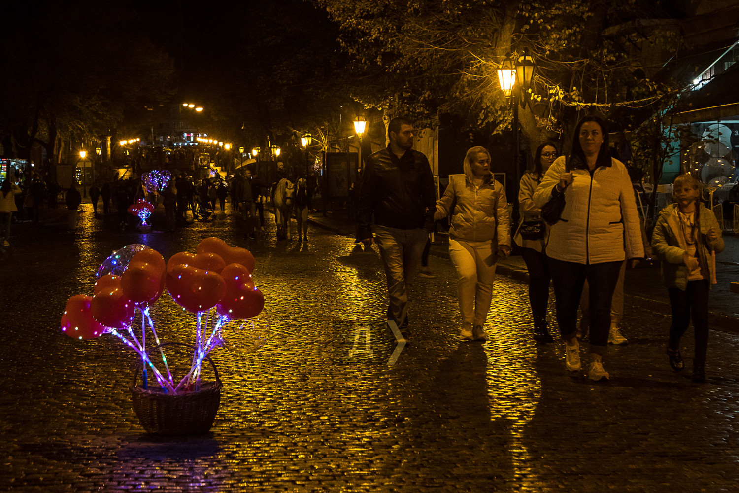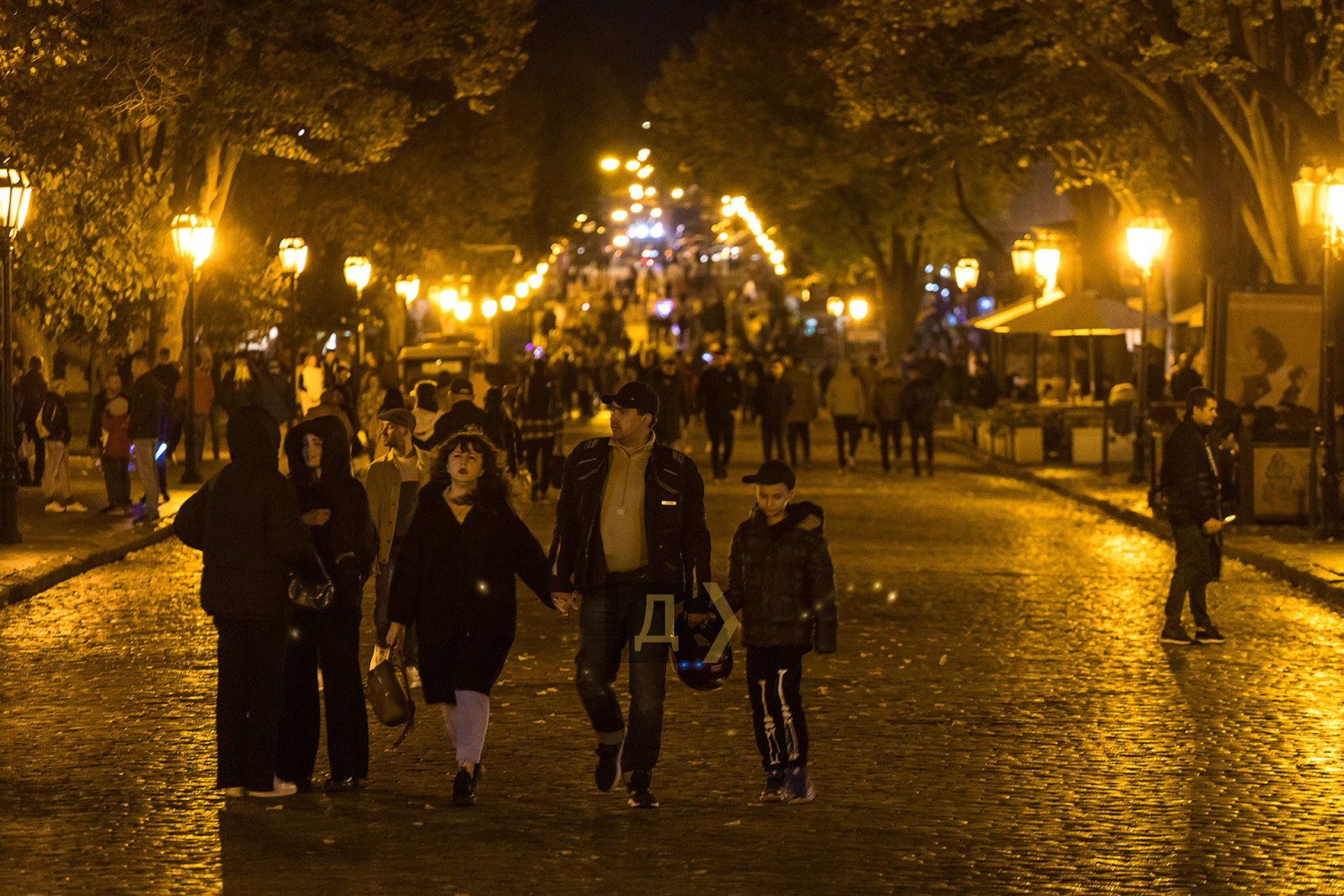 Фотокореспондент «Думської» прогулявся центральними вулицями Одеси після заходу сонця, щоб дізнатися, чим живе під час війни наше улюблене місто. На Дерибасівській життя буквально вирує — даються взнаки успіхи українських енергетиків, які примудрилися стабілізувати систему після атаки 10 жовтня і, звичайно ж, щоденна робота нашої ППО. Більшість, якщо не всі, кафе працюють, вуличне освітлення відбивається від мокрої бруківки, вуличні музиканти виступають, продавці миготливих куль і ростові ляльки-здирники не бідують. У Міськсаду проходить благодійний патріотичний концерт «З піснею до перемоги» кількох музичних гуртів. Хедлайнер — команда Kozak System — зриває овації, виконуючи як свої хіти, так і кавери на «Ой у лузі червона калина» та вірші Ліни Костенко «Крилатим ґрунту не треба». Вітрини магазинів прикрашені атрибутикою Гелловіна. До вашого задоволення будь-яка примха: від фотозони «Гарбуза на сіні» до спеціальних «страшних» коктейлів на кшталт «Вампірського капучино» і Маккіато з «Очним яблуком» у пересувній кав'ярні. Зустрічається молодь, переодягнена в нечисть. При цьому частина центру, прилегла до Приморського бульвару, який закритий з міркувань безпеки для святкової публіки, занурена в темряву. Фото — Олександр Гіманов СМЕРТЬ РОСІЙСЬКИМ ОКУПАНТАМ! Помітили помилку? Виділяйте слова з помилкою та натискайте control-enter |