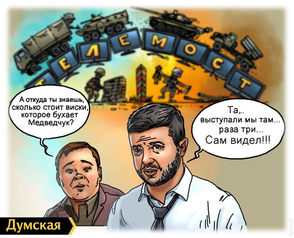 Штатные художники «Думской» Игорь Жеведь и Александр Бронзов отреагировали на обращение Владимира Зеленского, в котором тот критиковал предшественников и других политических оппонентов за намерение провести телемост между NewsOne и пропагандистским каналом «Россия 24».