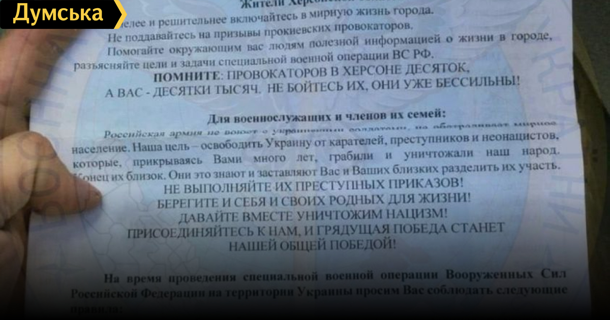 Война с коллективным Западом и ликвидация киевского режима: в Херсоне российские нацисты не скрывают настоящие цели войныОккупационная администрация Херсона пытается убедить местное население, что преступления российских нацистов в Украине совершаются во благо людей, а «вооруженные силы рф не воюют с украинским народом». Главное разведывательное управление Министерства обороны Украины опубликовало агитационную листовку, которую распространяют в городе. Речь в ней о том, что война началась из-за «западных планов» уничтожить русский и украинский народы. Саму войну называют операцией по ликвидации антинародного киевского режима. Виновными в российской агрессии сделали украинцев и избранную ими власть. «Горе, что постигло вас – результат преступной политики киевского режима», — написано в листовке. Фактически такие действия российских пропагандистов являются прямым признанием того, что эта война не имеет отношения к мифической «защите Донбасса», заявляют в Главном разведывательном управлении. Ее цель – уничтожение украинской государственности и оккупация всей Украины. «Не думайте, что это будет быстро и безболезненно», — особо отмечают российские нацисты. Это утверждение становится особенно актуальным, учитывая, что, согласно данным спутниковых снимков компании Planet Lab, за время оккупации на херсонском городском кладбище появились по меньшей мере 824 новые могилы. Кроме того, украинцев призывают стать коллаборантами и предупреждают об опасности приближаться к военным оккупационной армии. Также в листовке (даже после разоблачения преступлений в Буче и других украинских городах) утверждается, что «российская армия не воюет с украинскими солдатами и не обстреливает мирное население». В ГУР отмечают, что на сегодняшний день украинские и международные следователи тщательно исследуют все преступления, которые совершают оккупанты по прямым приказам российского руководства. Все они будут являться доказательствами для спецтрибунала как над непосредственными исполнителями, так и над властной верхушкой страны-оккупанта. СМЕРТЬ РОСІЙСЬКИМ ОКУПАНТАМ! Помітили помилку? Виділяйте слова з помилкою та натискайте control-enter |