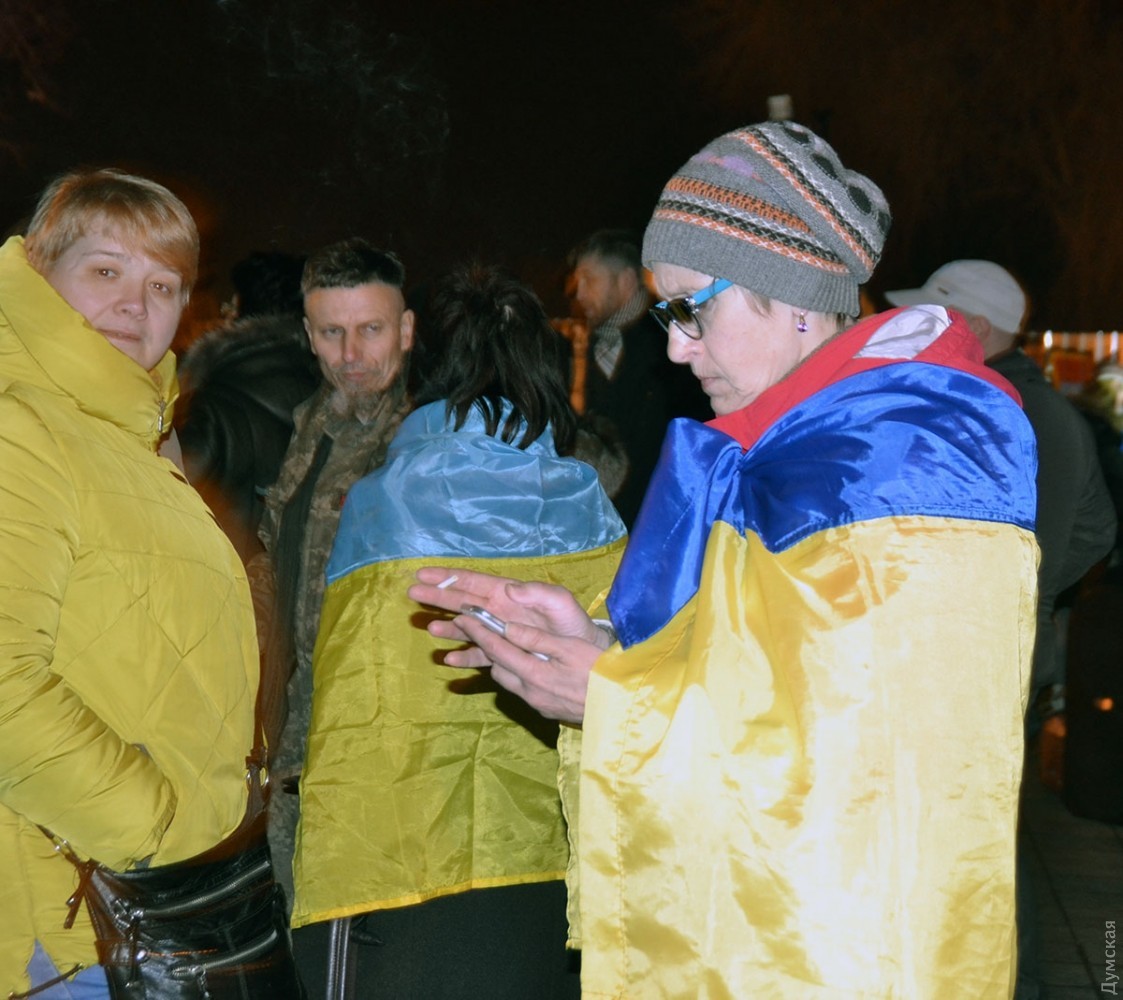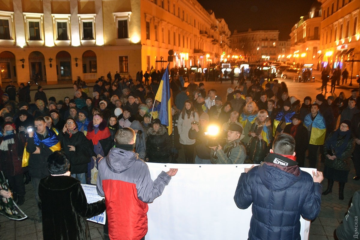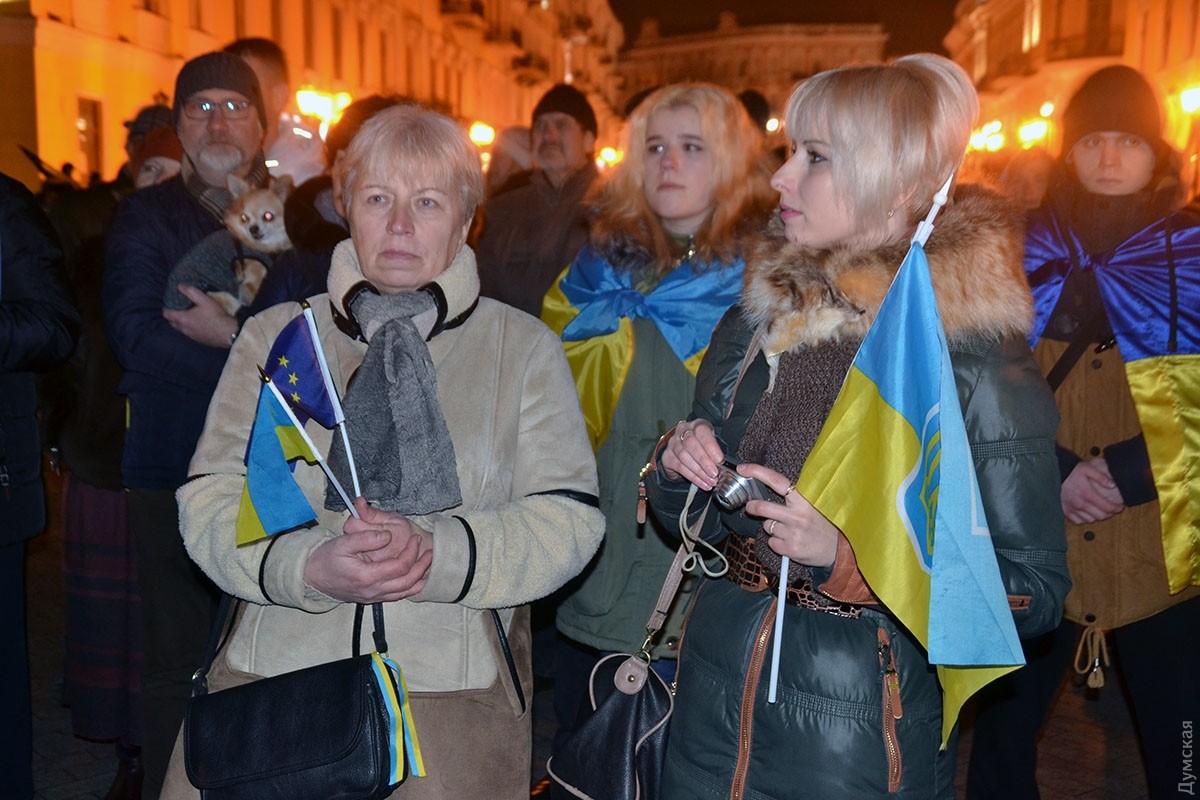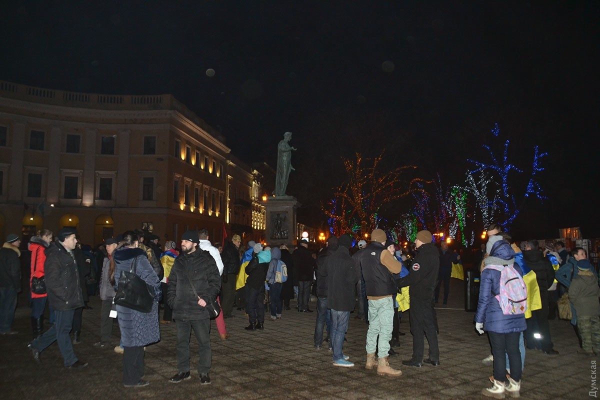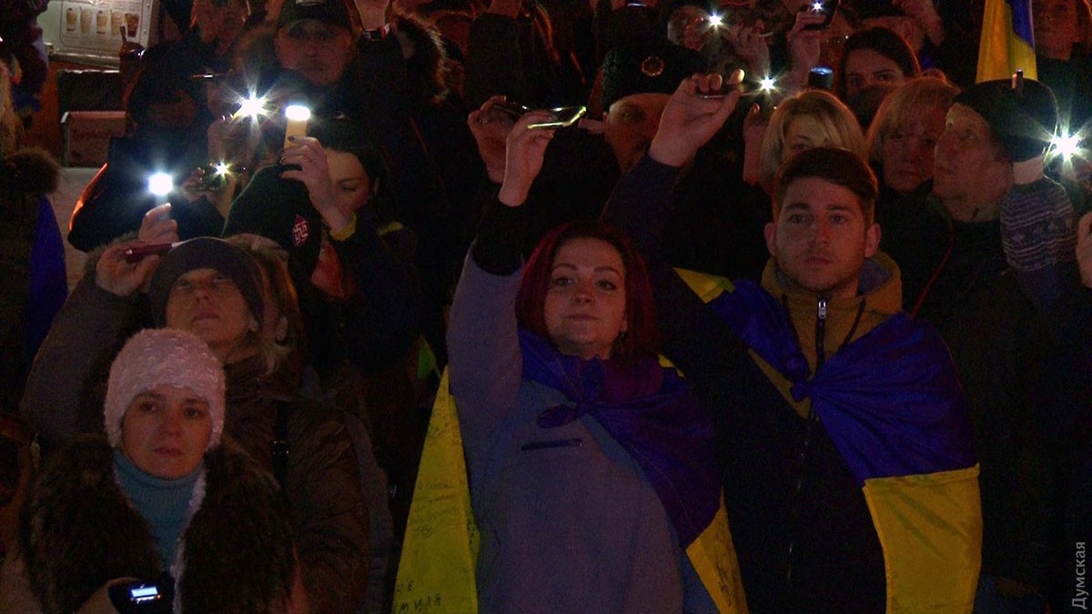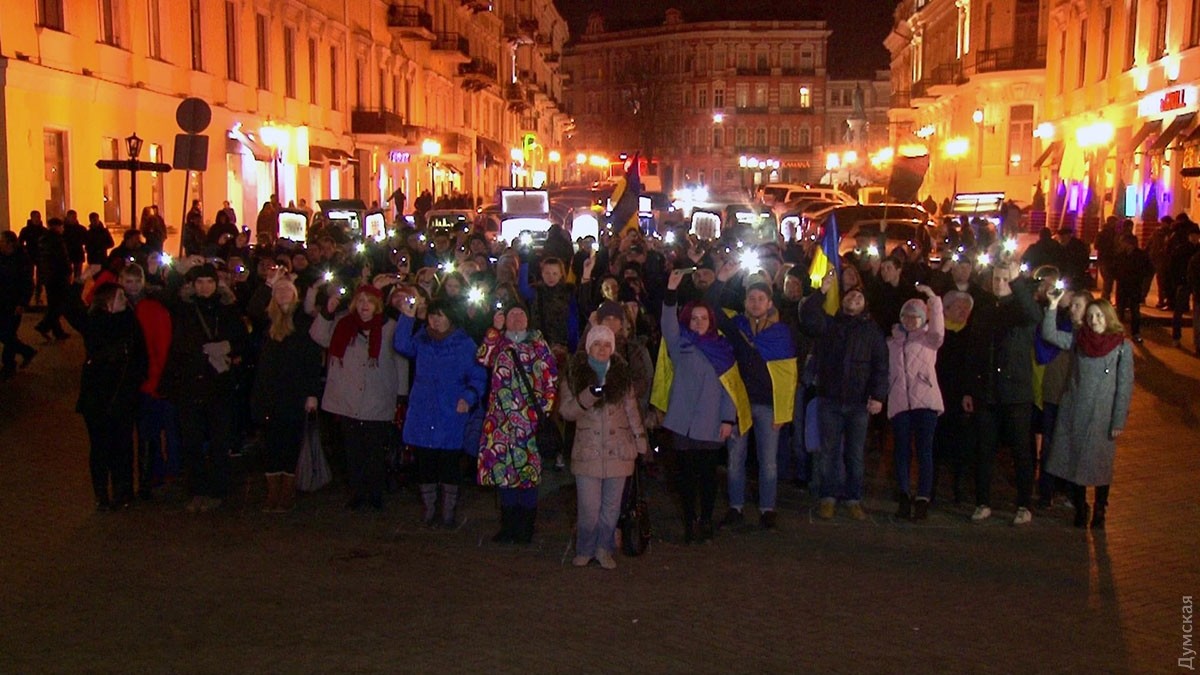 В ходе акции люди выстроились в форме тризубца и зажгли фонарики, после чего провели небольшой митинг и посмотрели короткий документальный фильм об одесском Евромайдане.