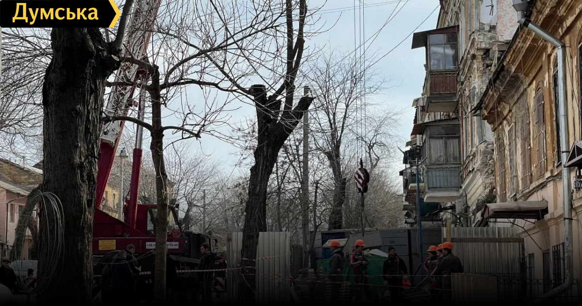 На улице Нежинской, где недавно произошло частичное обрушение дома №16, работает кран. По всей видимости, разбирают завалы.