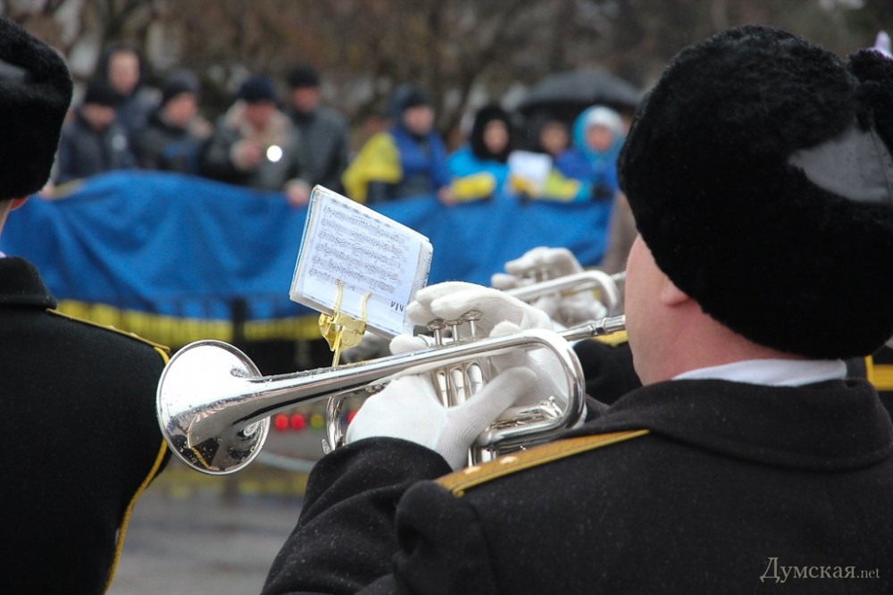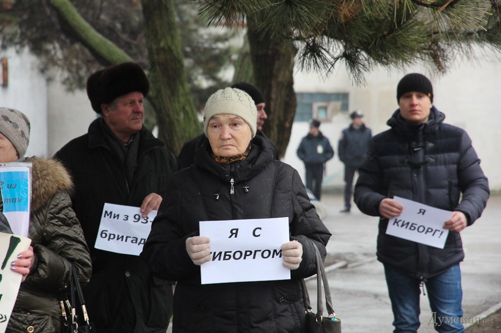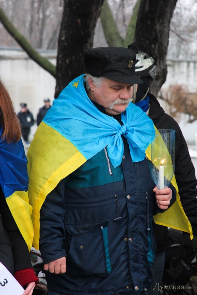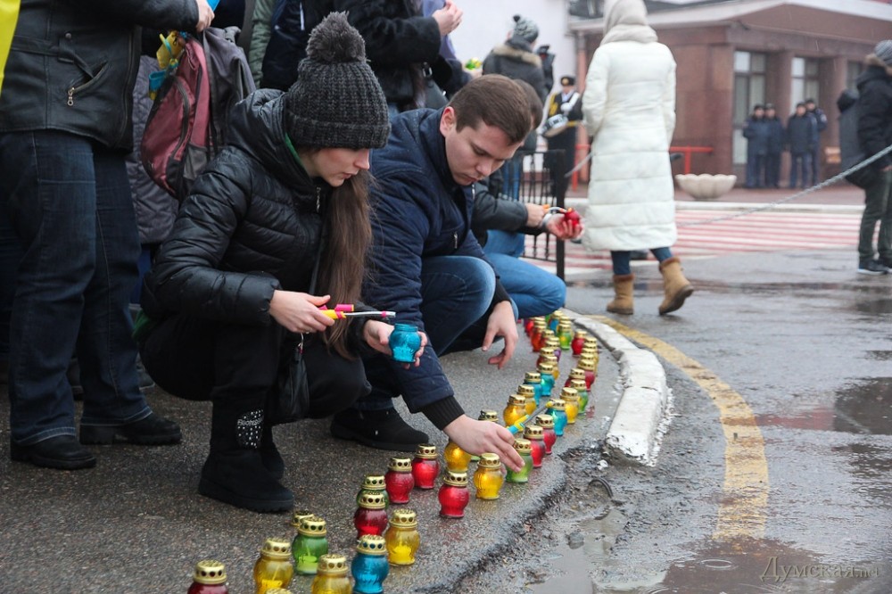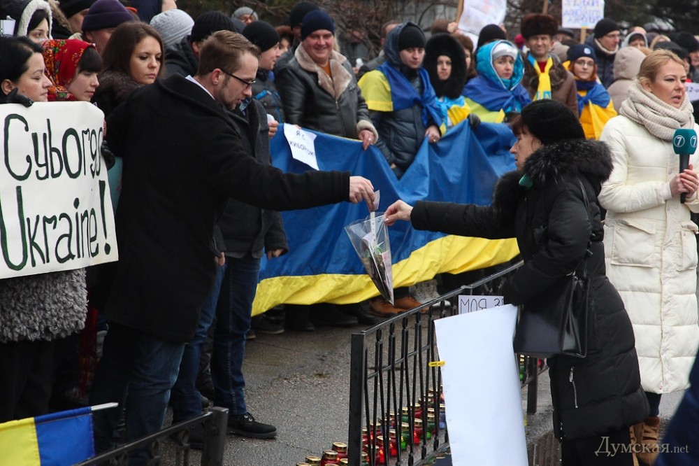 В ней приняло участие около 200 человек. Люди стояли с транспарантами «Мы - киборги» и «Мы - Мариуполь», а также с государственными флагами. Собравшиеся зажгли лампадки в память погибших защитников Украины и мирных жителей, после чего прошел сбор денег на закупку необходимого для раненых «киборгов», которые сейчас находятся в одесском военном госпитале. Акцию поддержали два оркестра — МВД и ВМСУ.