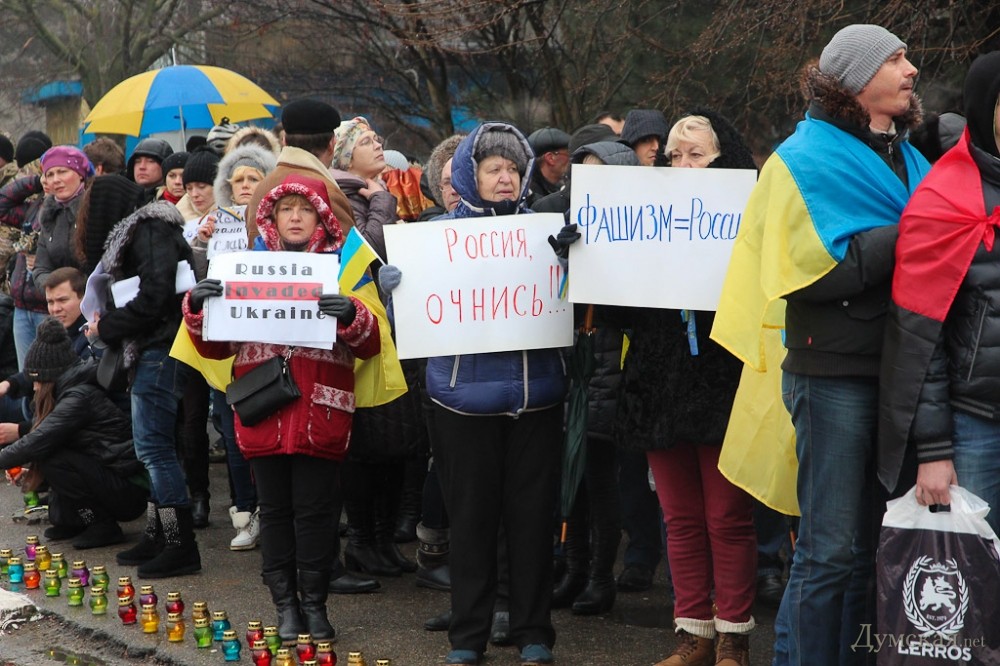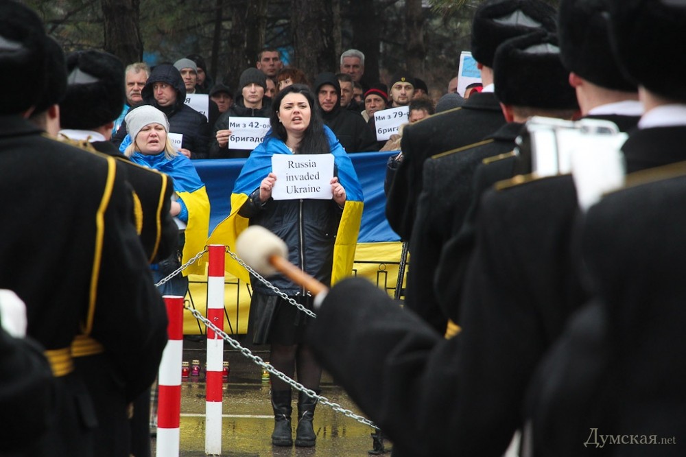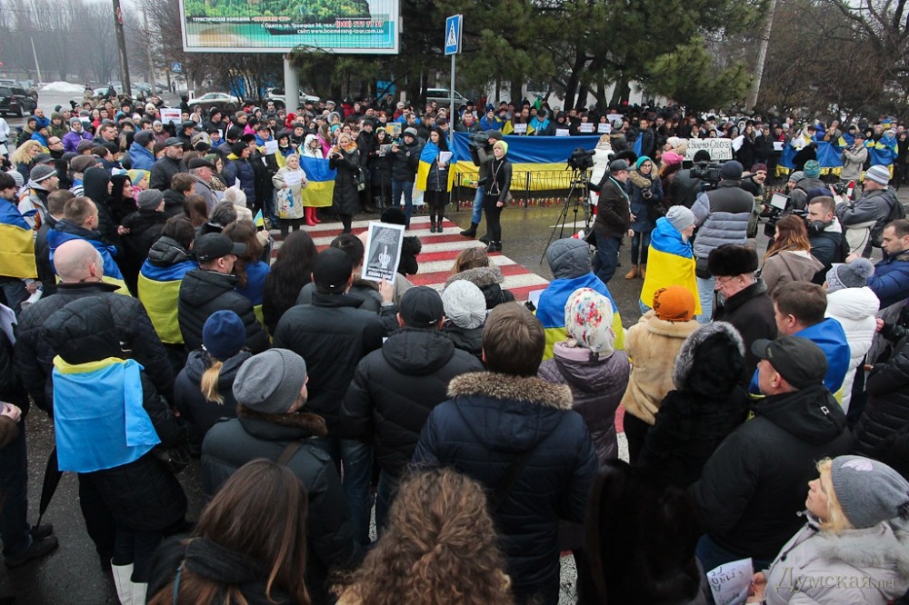 Я успела к концу акции у консульства. Рассказываю, что видела сама — под конец акции из толпы выделилась пожилая дама с портретом Дмитрия Яроша и стала говорить, ее не было слышно. Криками попросили дать тишину, чтобы услышать выступающую. Стало тихо, после чего дама, воздев портрет Яроша над головой пожелала последнему сдохнуть и сгореть в аду вместе с его ПС. Угадайте с трех раз, что последовало бы вслед за подобным выступлением на сборище«куликовцев», если бы аналогичным образом был воздет портрет кремлевской сволочи, к примеру. Тут даму прервали, попросили остановиться и взяв под руку, просто отодвинули назад к собравшимся. Впрочем, вело сьемку и тв «Думской» и другие одесские каналы вели эфир, так что все можно будет увидеть своими глазами. А может быть на рашатудей уже пустили репортаж о расчленении думающих по-другому на Аркадийском плато, не удивлюсь. На следующие выходные запланирован марш аналогично десятитысячному маршу одесситов прошлой весной, в 12 возле Дюка, я только не расслышала в следующую субботу или воскресенье, будет самоорганизация в соцсетях. Знаю от своих знакомых, что в аэропорту присутствовал Аднан Киван.