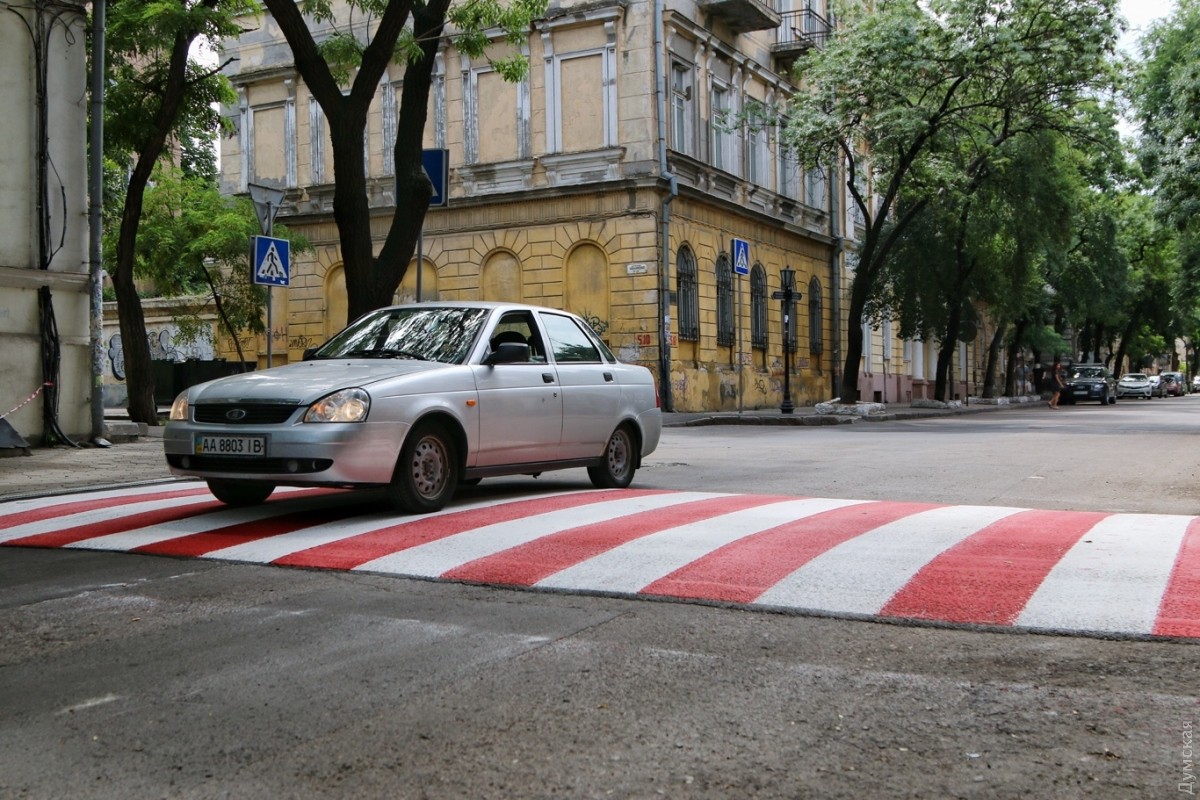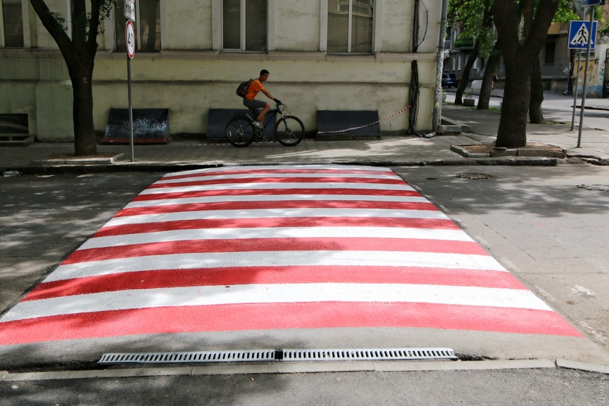 Подобные пешеходные переходы, согласно европейским нормам, признаны более безопасными, так как автомобилисты вынуждены снижать перед ними скорость. Новые пешеходные переходы получили яркую красно-белую разметку, а ближе к бордюру они оборудованы ливневыми канавами.