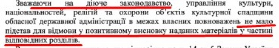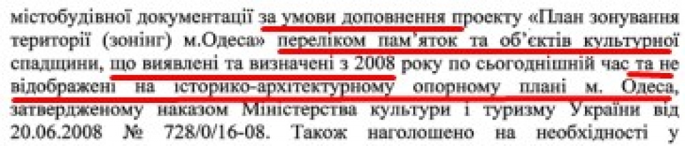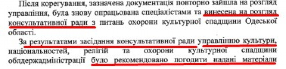 Второе согласование разработчики и заказчики зонинга должны были получить в управлении культуры, национальностей, религий и охраны культурного наследия ОГА. Здесь ситуация обстоит веселее. Еще на презентации 18 августа выяснилось, что подписала «согласование» даже не и.о. начальника Елена Олейник, а ее заместитель – О.В.Воробьева. Это сразу вызвало подозрение у присутствующих депутатов горсовета: с чего вдруг, в курсе ли начальник? К сожалению, на момент написания этой статьи ответ на запрос депутата Аллы Поздняковой, которая просила передать копию согласования, так и не пришел. Общественному деятелю Игорю Елину повезло больше: ответ он получил причем от самой Олейник. Правда, самого согласования там не было, но информация оказалась любопытной.