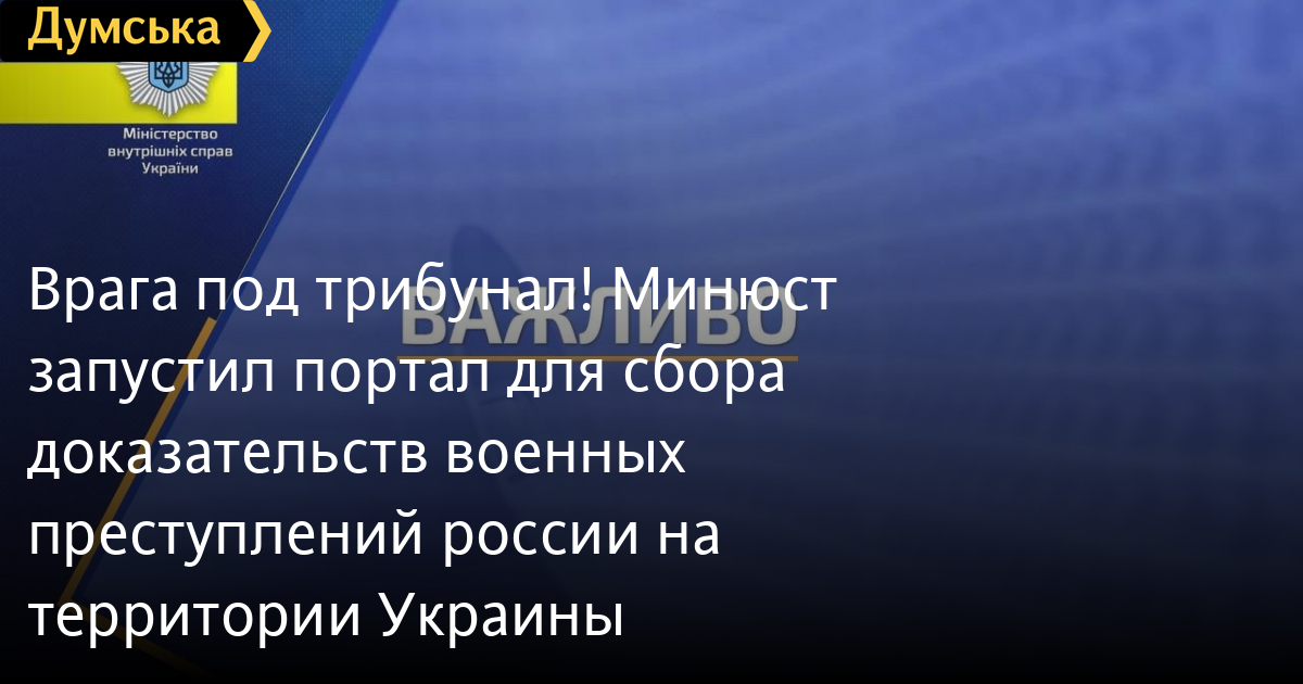 Врага под трибунал! Минюст запустил портал для сбора доказательств военных преступлений россии на территории УкраиныМинистерство юстиции запустило портал, где собирает все доказательства преступлений оккупанта на нашей земле. Собранные данные будут использованы в Международном уголовном суде в Гааге, чтобы отдать врага под трибунал за совершенные военные преступления. Каждый, кто стал свидетелем боевых действий врага, насилия, диверсий, может прислать информацию. «Российские войска уничтожают нашу инфраструктуру, стратегические объекты, разрушают целые города. За это враг должен быть наказан и понести ответственность», — сообщают власти. СМЕРТЬ РОСІЙСЬКИМ ОКУПАНТАМ! Помітили помилку? Виділяйте слова з помилкою та натискайте control-enter |