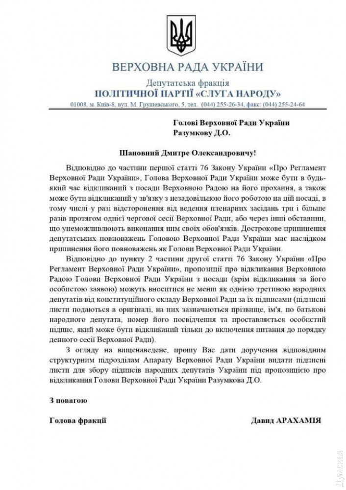 «Вспоминается Тарас Бульба»: нардепы-«слуги» собирают подписи за отставку Разумкова с должности спикера парламентаГлава парламентской фракции партии «Слуга народа» Давид Арахамия запросил подписные листы о снятии спикера Дмитрия Разумкова. Соответствующий документ обнародовал народный депутат от партии «Европейская солидарность» Алексей Гончаренко. В тексте Арахамия обращается к Разумкову и просит дать поручение соответствующим структурным подразделениям Аппарата Верховной Рады Украины выдать подписные листы для сбора подписей нардепов с предложением отозвать Председателя Рады Разумкова. «Мы не голосовали за его назначение, мы не будем голосовать за его снятие. Но вспоминается, конечно же, Тарас Бульба», — написал Гончаренко. Отметим, Дмитрий Разумков отреагировал на обращение в Facebook. «Сразу расписал документ на Аппарат Верховной Рады Украины. Как и обещал, медлить с процессом не буду. Сегодня коллеги получат подписные листы. Продуктивной работы в Трускавце!» — написал Разумков. СМЕРТЬ РОСІЙСЬКИМ ОКУПАНТАМ! Помітили помилку? Виділяйте слова з помилкою та натискайте control-enter |