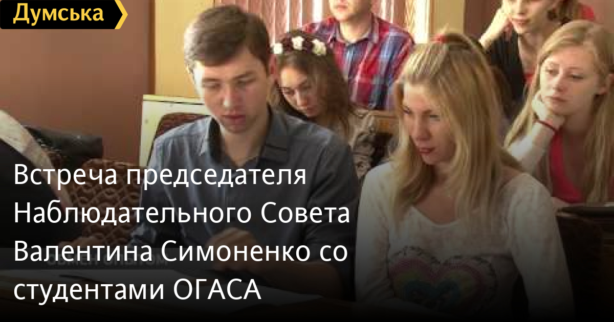 Встреча председателя Наблюдательного Совета Валентина Симоненко со студентами ОГАСАВ огромной аудитории нет свободных мест. На встречу с председателем Наблюдательного Совета Валентином Симоненко пришли сотни студентов Одесской государственной Академии строительства и архитектуры. Заслуженный экономист Украины пятьдесят четыре года назад окончил этот ВУЗ. Теперь он делится опытом достижения профессиональных вершин с молодым поколением. СМЕРТЬ РОССИЙСКИМ ОККУПАНТАМ! Заметили ошибку? Выделяйте слова с ошибкой и нажимайте control-enter Думская ТВ. Сюжеты: