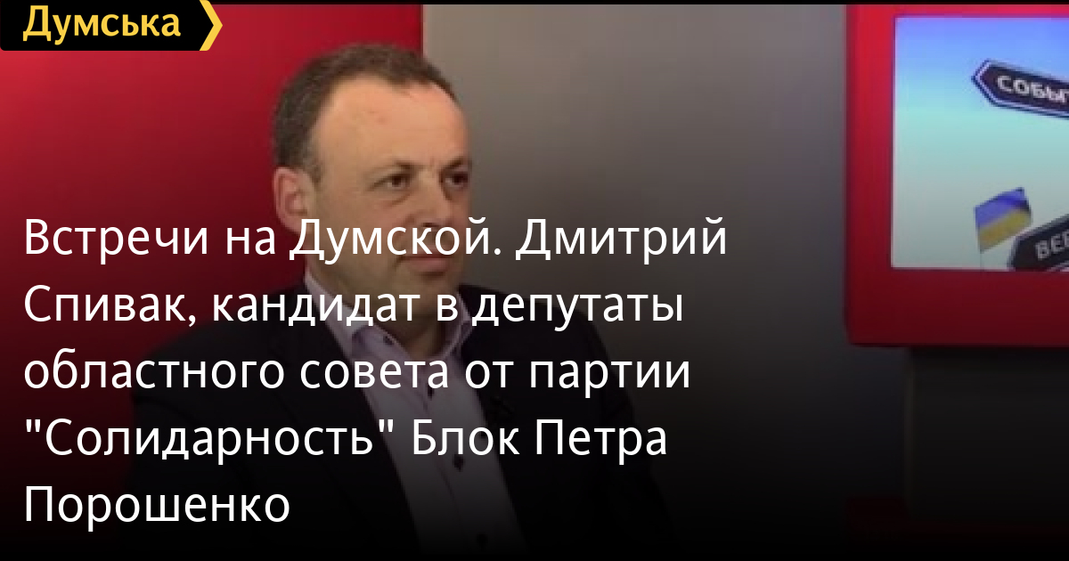 Встречи на Думской. Дмитрий Спивак, кандидат в депутаты областного совета от партии «Солидарность» Блок Петра ПорошенкоВстречи на Думской. Дмитрий Спивак, кандидат в депутаты областного совета от партии «Солидарность» Блок Петра Порошенко СМЕРТЬ РОССИЙСКИМ ОККУПАНТАМ! Заметили ошибку? Выделяйте слова с ошибкой и нажимайте control-enter Думская ТВ. Встречи на Думской: