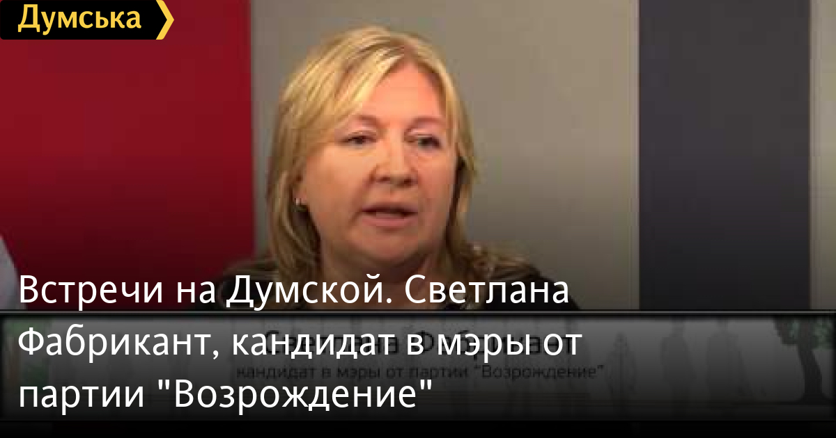 Встречи на Думской. Светлана Фабрикант, кандидат в мэры от партии «Возрождение»Встречи на Думской. Светлана Фабрикант, кандидат в мэры от партии «Возрождение» СМЕРТЬ РОССИЙСКИМ ОККУПАНТАМ! Заметили ошибку? Выделяйте слова с ошибкой и нажимайте control-enter Думская ТВ. Встречи на Думской: