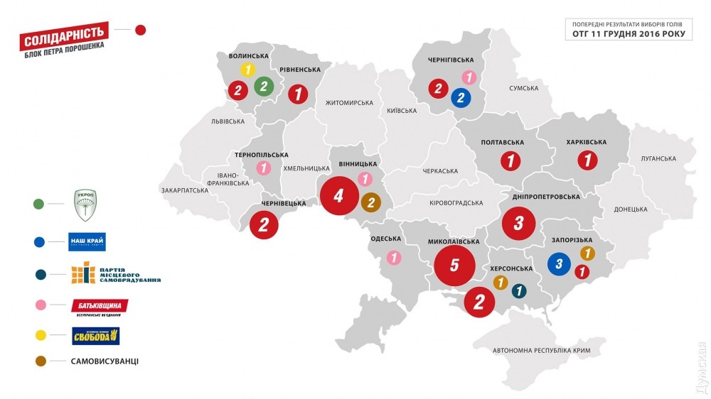 Выборы в Одесской области: председателем Затишанской объединенной громады стал представитель «Батькивщины»Вчера в 13 областях Украины прошли первые местные выборы в 41 объединенной тергромаде. В том числе выборы состоялись и в Одесской области – в Затишанском поселковом совете Захаровского (Фрунзовского) района. Как сообщают наблюдатели ГС ОПОРА, по предварительным данным, жители Затишанской объединенной территориальной громады избрали председателем действующего главу поссовета Геннадия Топольницкого («Батькивщина») Его поддержали 1225 избирателей, или 66,32%. Бывший глава Фрунзовской райадминистрации Павел Шестопалюк набрал 452 голоса, или 24,47%. Жители громады избрали и депутатов поселкового совета. Большинство получили представители «БПП« Солидарность». Напомним, накануне выборов председатель Захаровской районной администрации Дмитрий Франчук оказывал активную поддержку «Батькивщине» и был завсегдатаем в штабе партии. Похожая ситуация наблюдается в Ширяевском районе, в котором выборы назначены на 18 декабря: во время предвыборной кампании председатель райадминистрации Тарас Бойко открыто агитирует за своего кандидата и проводит контрагитацию против чужого. В том числе, для пиар-кампании чиновник использует газеты и сайт РГА. СМЕРТЬ РОСІЙСЬКИМ ОКУПАНТАМ! Помітили помилку? Виділяйте слова з помилкою та натискайте control-enter Новини по цій темі: 18 березня 2023: Експеримент: в Одеській області на селищному кладовищі вирішили безкоштовно надавати інвентар для догляду за могилами (фото) 29 липня 2021: В Одессу съехались мэры городов со всей Украины, чтобы обговорить реформу самоуправления (фото) 12 травня 2021: В рамках децентрализации три украинских города вырастут вширь |