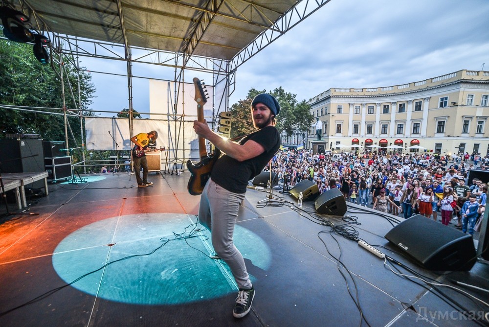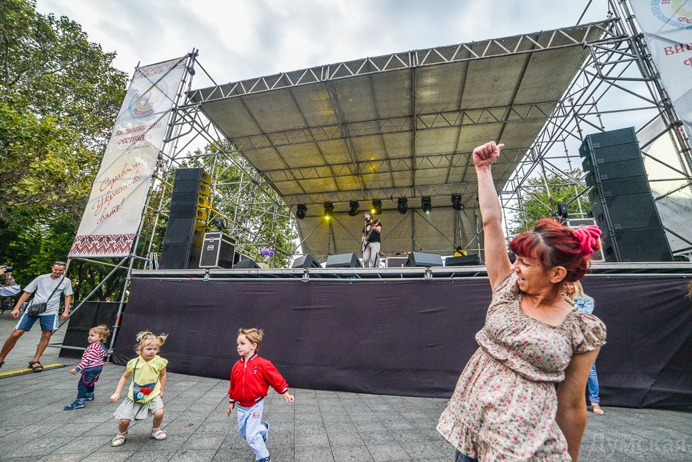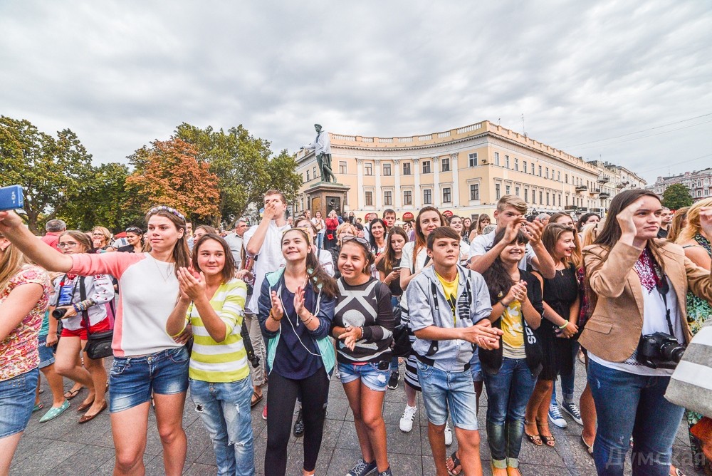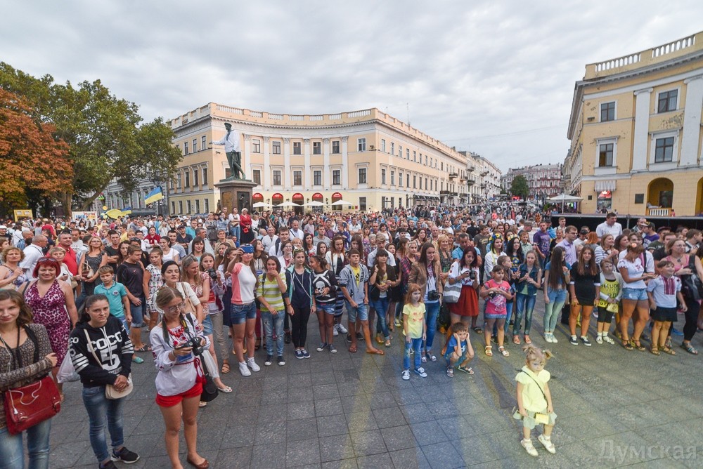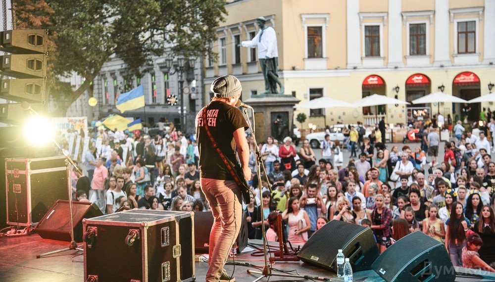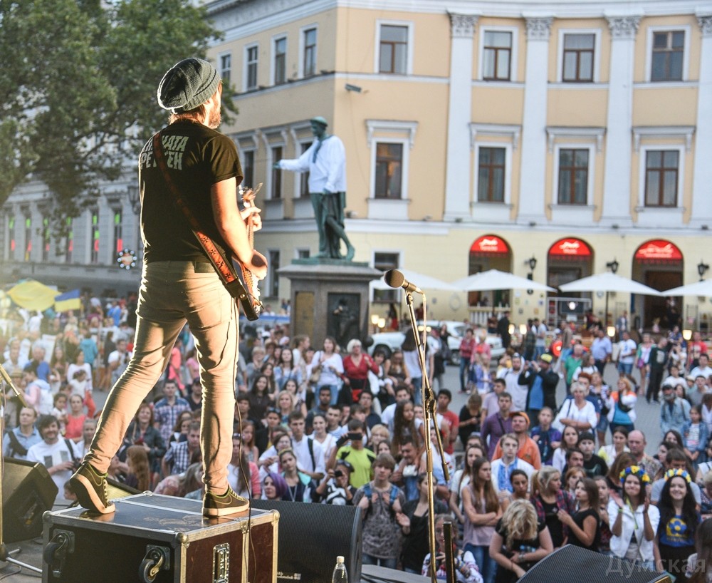 У памятника Дюку в рамках Вышиванкового фестиваля проходит концерт, приуроченный ко Дню государственного флага и Дню независимости Украины. Только что одесситов и гостей города порадовала своей музыкой группа «Кімната Гретхен».