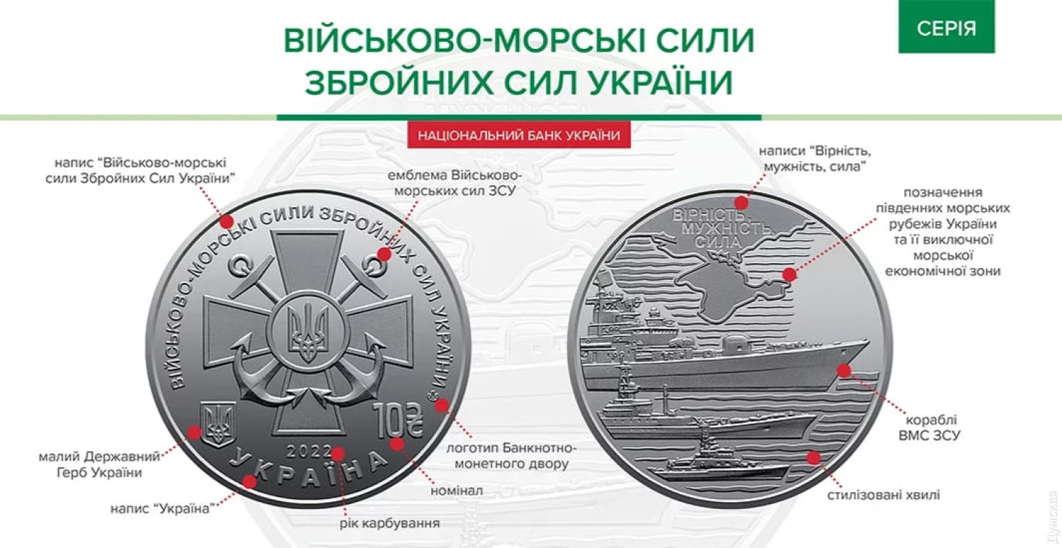 Нацбанк Украины представил новую памятную монету номиналом 10 гривен, посвященную Военно-Морским Силам ВС Украины. На аверсе расположена эмблема ВМСУ, слева внизу — Малый Государственный герб Украины, справа внизу – номинал и графический символ гривны. На реверсе изображены корабли ВМСУ – сверху фрегат «Гетман Сагайдачный», по центру СДК «Юрий Олефиренко», ниже патрульный катер типа «Айленд». В описании монеты говорится, что она «посвящена отдельному виду Вооруженных Сил Украины, предназначенному для сдерживания или отпора во взаимодействии с другими видами Вооруженных Сил, другими военными формированиями и правоохранительными органами вооруженной агрессии против Украины с моря и на приморских направлениях, защиты суверенитета и государственных интересов Украины». СМЕРТЬ РОСІЙСЬКИМ ОКУПАНТАМ! Помітили помилку? Виділяйте слова з помилкою та натискайте control-enter |