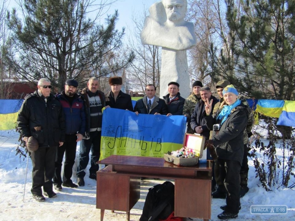 Таким образом, район присоединился к акции «Велика Українська хода». Флаги вывесили в центре города, у памятника Тарасу Шевченко. пишет «Трасса Е-95». Объезжая населенные пункты страны, активисты намеревались собрать сто флагов Украины как символ «Небесной сотни», однако ананьевское полотнище стало уже 103-м.