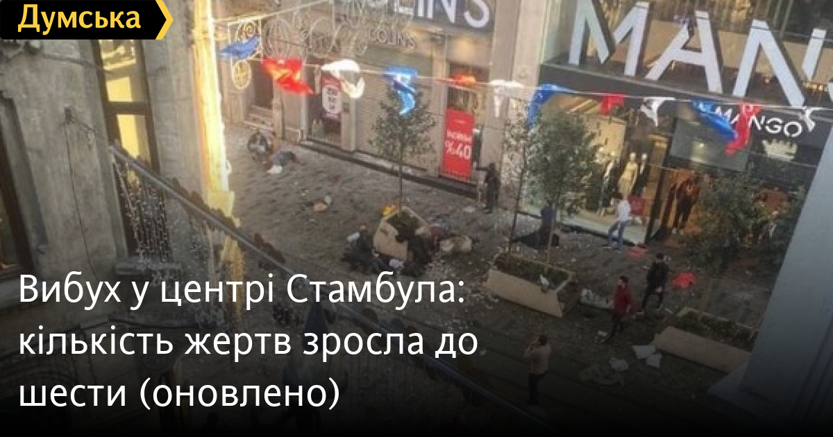 Вибух у центрі Стамбула: кількість жертв зросла до шести (оновлено)Кількість загиблих унаслідок сьогоднішнього вибуху в центрі Стамбула зросла до шести, поранених — до 53. Про це повідомив на прес-конференції президент Туреччини Реджеп Ердоган, повідомляє державне турецьке агентство Anadolu. «Наша нація має бути впевнена, що винуватці інциденту на вулиці Істікляль будуть покарані, як вони заслуговують. Відповідні підрозділи нашої держави продовжують свої зусилля з розкриття виконавців цього підступного нападу та асоціацій, що стоять за ним», — зазначив він. ОНОВЛЕНО О 21:39. Кількість постраждалих досягла 81. Як повідомив віцепрезидент Туреччини Фуат Октай, вибух влаштувала смертниця, передає ВВС. СМЕРТЬ РОСІЙСЬКИМ ОКУПАНТАМ! Помітили помилку? Виділяйте слова з помилкою та натискайте control-enter |