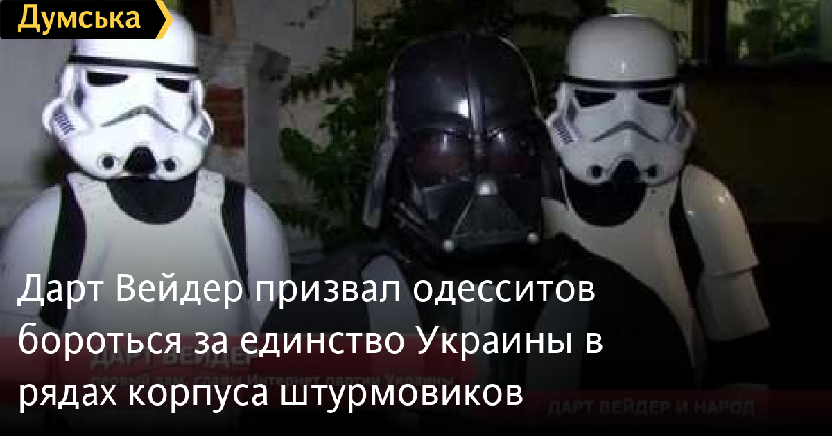Дарт Вейдер призвал одесситов бороться за единство Украины в рядах корпуса штурмовиковДарт Вейдер встретился с народом. Перед показом «Звездных воин» во вновь заработавшем летнем кинотеатре на Приморском бульваре политик и военачальник пообщался с одесситами. Темный Лорд призвал всех бороться за целостность Украины и записываться добровольцами в корпус штурмовиков. СМЕРТЬ РОССИЙСКИМ ОККУПАНТАМ! Заметили ошибку? Выделяйте слова с ошибкой и нажимайте control-enter Думская ТВ. Сюжеты: