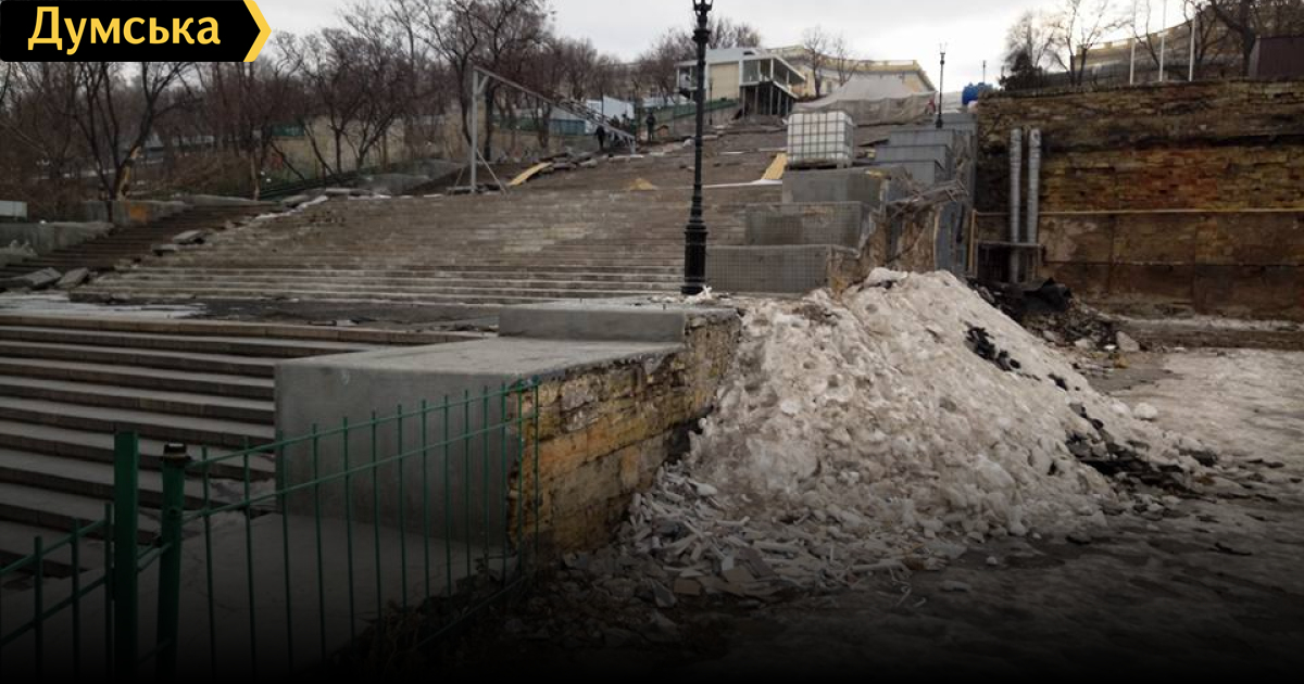 Гадюшник — это сессия горсовета. А с лестницей все было в порядке до начала "ремонта". (И с Тираспольской площадью, кстати, тоже. И с Аркадией). Что за быдляцкая маничка, аутентичное валять и на его месте клепать новодел. Еще и некачественный.