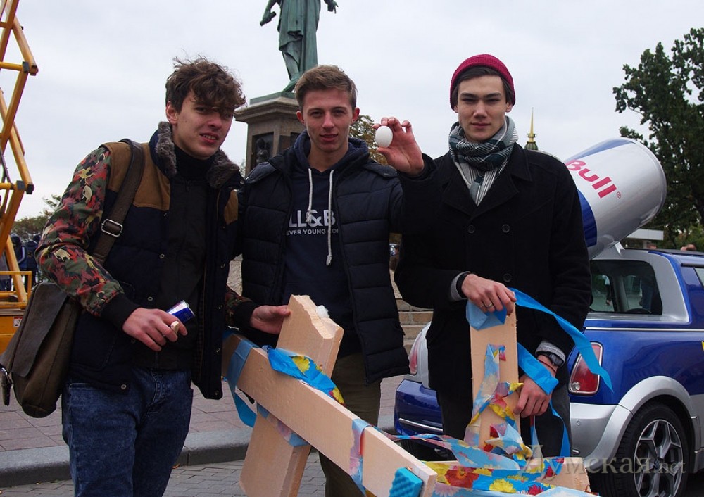 Энергетический напиток, известный не только своими агрессивным химическим воздействием на организм, но и эпатажной рекламной политикой, захватывает Одессу. Банки с «красным бычком» продаются у нас довольно давно, но настоящий рекламный ивент данной торговой марки состоялся впервые. Если помните, прошлая попытка производителя энергетиков поразить воображение одесской публики сорвалась из-за противодействия ректората экономического университета. Впрочем, и анонсированное на сегодня действо нельзя назвать полноценным. У памятника Дюка хотели устроить своеобразное состязание доморощенных инженеров. Задание — создать креативный аппарат площадью не больше одного квадратного метра, который поможет сбросить сырое куриное яйцо с пятнадцатиметровой высоты так, чтобы оно коснулось земли и не разбилось. «Думская», само собой, явилась в указанное организаторами время на Приморский бульвар, но не тут-то было. Представители компании объявили, что мероприятие отменяется: из заявленных пятнадцати команд до места проведения Gravity challenge добралась лишь одна, а посему, мол, в проведении конкурса смысла нет. Но чтобы не расстраивать зрителей, единственный участник все же запустил свой летательный аппарат, после чего на высоту 15 метров начали поднимать всех желающих. СМЕРТЬ РОСІЙСЬКИМ ОКУПАНТАМ! ![]() Единственный участник несостоявшихся соревнований - команда Seagulls. Их летательный аппарат из пластиковых досок, губок для мытья посуды и порезанного полиэтилена Помітили помилку? Виділяйте слова з помилкою та натискайте control-enter |