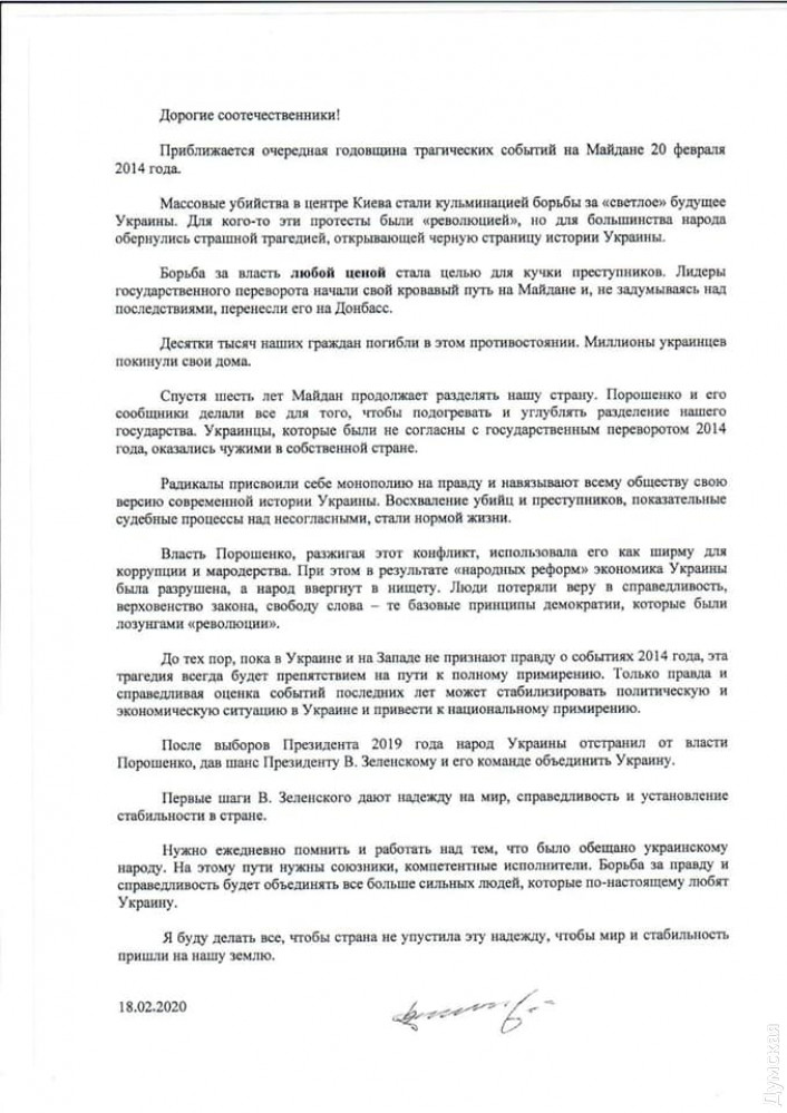 Беглый президент Украины Виктор Янукович написал обращение, в котором выразил надежду, что президент Владимир Зеленский сможет объединить страну и заявил о готовности помочь ему. Обращение Януковича опубликовал его адвокат в Фейсбуке. «После выборов Президента 2019 года народ Украины отстранил от власти Порошенко, дав шанс президенту В.Зеленскому и его команде объединить Украину. Первые шаги Зеленского дают надежду на мир, справедливость и установление стабильности в стране. Нужно ежедневно помнить и работать над тем, что было обещано украинскому народу. На этом пути нужны союзники, компетентные исполнители…Я буду делать все, чтобы страна не упустила эту надежду, чтобы мир и стабильность пришли на нашу землю», — говорится в письме Януковича. Он также заявил, что события на Майдане в 2014 году были якобы государственным переворотом, который разделил страну и в который раз обвинил пятого президента Украины Петра Порошенко «в разжигании конфликта на Донбассе». СМЕРТЬ РОССИЙСКИМ ОККУПАНТАМ! Заметили ошибку? Выделяйте слова с ошибкой и нажимайте control-enter |