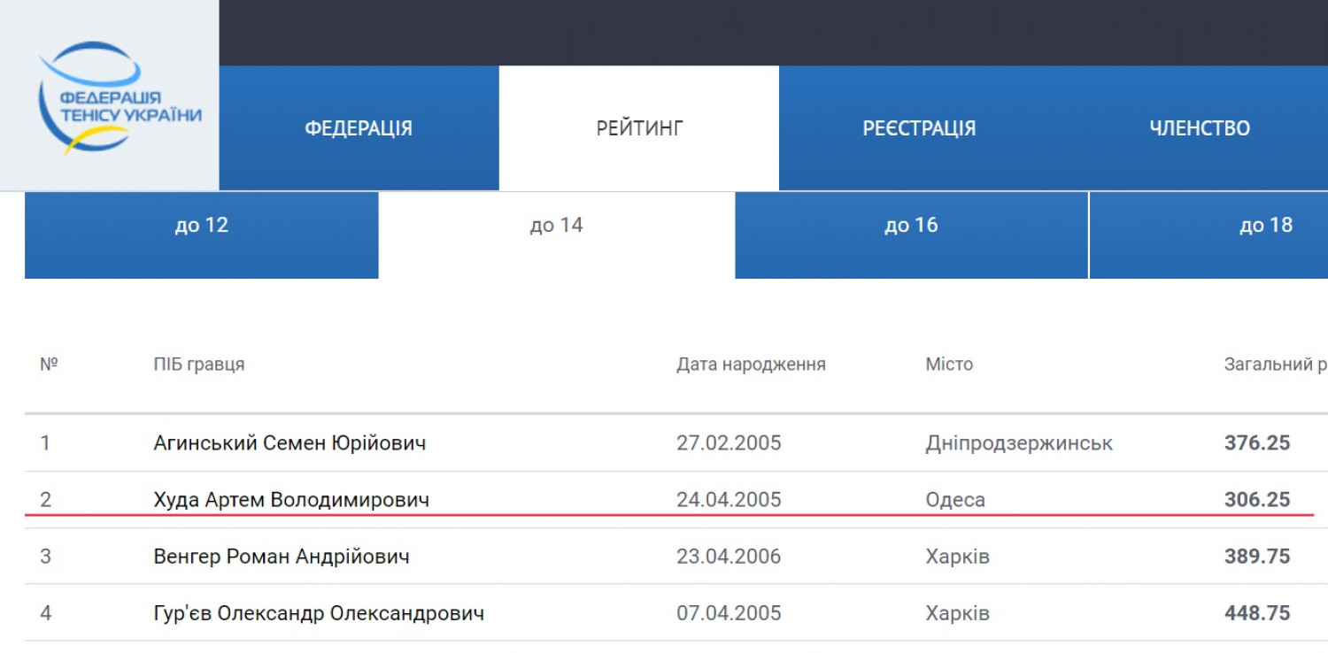14-летний одессит Артем Худа достойно выступил на всеукраинском турнире по теннису «Кубок Премьер», завоевав бронзу в одиночной игре и серебро в парах. Ранее, 28 февраля, на турнире «Фортуна» (до 16 лет) Артем завоевал две золотые медали — в одиночном и парном разрядах. Теперь по итогам всех пройденных турниров Артем занимает второе место в украинском рейтинге теннисистов до 14 лет и седьмое в общем рейтинге (где суммируются баллы украинских и зарубежных турниров). Сам Артем говорит, что не представляет своего будущего без тенниса и мечтает попасть в Олимпийскую сборную Украины. СМЕРТЬ РОСІЙСЬКИМ ОКУПАНТАМ! Помітили помилку? Виділяйте слова з помилкою та натискайте control-enter |