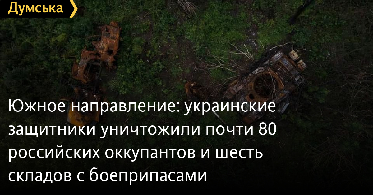 Південний напрямок: українські захисники знищили майже 80 російських окупантів та шість складів із боєприпасамиШість складів боєприпасів знищили українські захисники на південній ділянці фронту. Про це повідомляє оперативне командування «Південь». Об'єкти знаходились у Бериславському та Херсонському районах Херсонської області. Крім того, ворог втратив 79 військовослужбовців, чотири танки Т-72, дві самохідні гаубиці «Мста-С», радіолокаційну станцію та командно-штабну машину, десять одиниць броньованої та 11 іншої автомобільної техніки. Вражені два пункти управління 76-ї десантно-штурмової дивізії та 49-ї армії вс рф у Чорнобаївці, один командно-спостережний пункт ворожої батальйонної тактичної групи у Брускінському та район зосередження озброєння та техніки в Олешках. Остаточні втрати ворога уточнюються. СМЕРТЬ РОСІЙСЬКИМ ОКУПАНТАМ! Помітили помилку? Виділяйте слова з помилкою та натискайте control-enter |