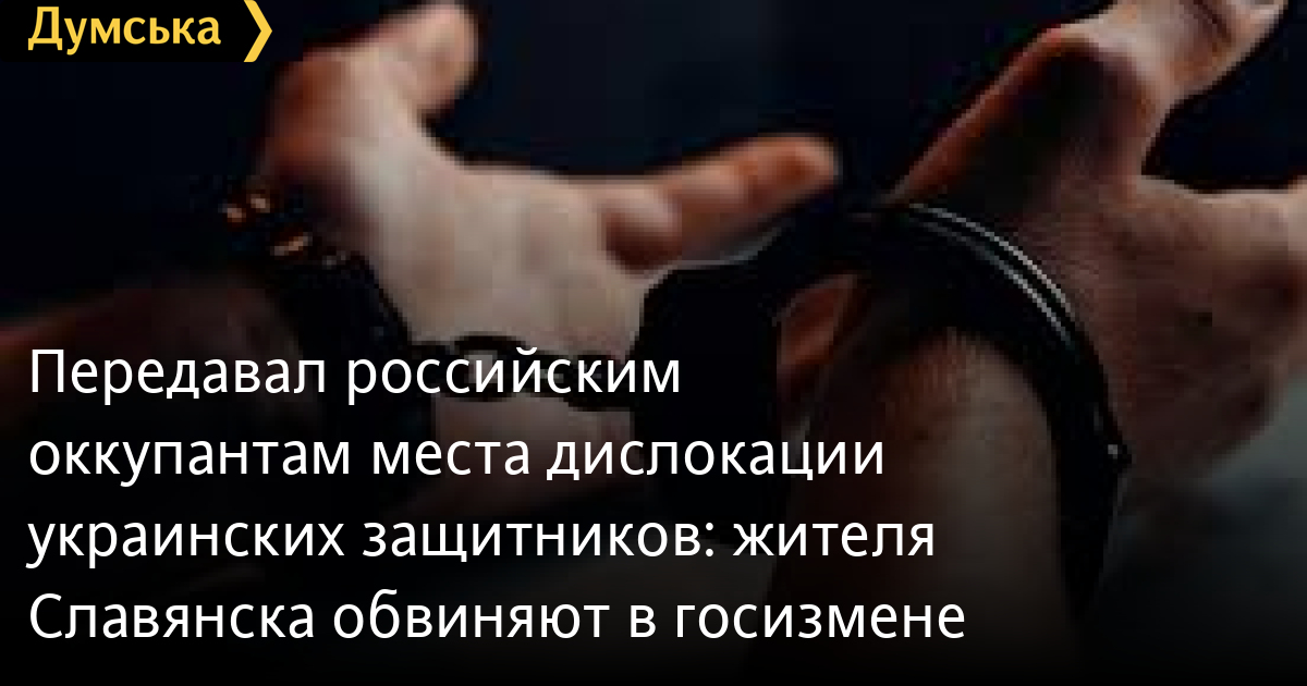 Передавал российским оккупантам места дислокации украинских защитников: жителя Славянска обвиняют в госизменеПравоохранители взяли под стражу жителя Славянска, который, по информации следствия, передавал российским оккупантам места дислокации украинских защитников. Как сообщает Офис генпрокурора, 18 мая правоохранители задержали и взяли под стражу 56-летнего жителя Славянска, который добровольно помогал российским солдатам. Мужчина неоднократно передавал врагу информацию с координатами мест дислокации Вооруженных Сил Украины и других военных формирований, привлеченных к борьбе с российским агрессором. По данным прокуратуры, российские солдаты использовали полученную от мужчины информацию против украинских защитников. В среду, 18 мая, жителя Славянска арестовали. Мужчину подозревают в совершении государственной измены в условиях военного положения (ч. 2 ст. 111 действующего Уголовного кодекса Украины). Ему избрали меру пресечения в виде содержания под стражей без возможности внесения залога. СМЕРТЬ РОСІЙСЬКИМ ОКУПАНТАМ! Помітили помилку? Виділяйте слова з помилкою та натискайте control-enter |
