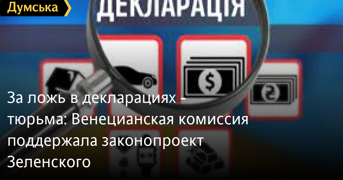 За ложь в декларациях — тюрьма: Венецианская комиссия поддержала законопроект ЗеленскогоЕвропейская комиссия за демократию через право (Венецианская комиссия) одобрила законопроект президента Украины Владимира Зеленского о наказании в виде тюремного заключения за недостоверные данные в декларации о доходах. Как говорится в заключении комиссии, законопроект разработан в соответствии с международными обязательствами Украины. Вместе с тем, комиссия отмечает, что одного лишь усиления санкций за недостоверное декларирование недостаточно, необходимо также усиление антикоррупционных институтов. В комиссии также выразили сожаление по поводу того, ужесточение санкций будет применяться лишь после 1 апреля 2022 года. Напомним, что Верховная Рада приняла за основу законопроект о восстановлении наказания в виде лишения свободы за недостоверные данные в декларациях в середине апреля. СМЕРТЬ РОССИЙСКИМ ОККУПАНТАМ! Заметили ошибку? Выделяйте слова с ошибкой и нажимайте control-enter |