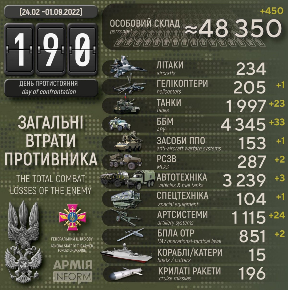 За минулу добу українські захисники знищили 450 окупантів, 23 ворожі танки і 24 артсистеми450 осіб, 23 танки і один гелікоптер втратили окупанти за минулу добу в Україні. Крім того, за даними Генерального штабу Збройних сил України, наші захисники також знищили 33 бойові броньовані машини, 24 артсистеми, дві РЗСВ, один засіб ППО, два БПЛА оперативно-тактичного рівня, три одиниці автомобільної техніки і одну одиницю спецтехніки. Усього з початку повномасштабного вторгнення втрати ворога склали: особового складу — 48 350 осіб; танків ‒ 1997 одиниць; бойових броньованих машин ‒ 4345 одиниць; артилерійських систем – 1115 одиниць; РСЗВ – 287 одиниць; засоби ППО - 153 одиниці; літаків – 234 одиниці; гелікоптерів – 205 одиниць; БПЛА оперативно-тактичного рівня – 851; крилаті ракети — 196; кораблі /катери -15 одиниць; автомобільної техніки та автоцистерн – 3239 одиниць; спеціальна техніка — 104. СМЕРТЬ РОСІЙСЬКИМ ОКУПАНТАМ! Помітили помилку? Виділяйте слова з помилкою та натискайте control-enter |
