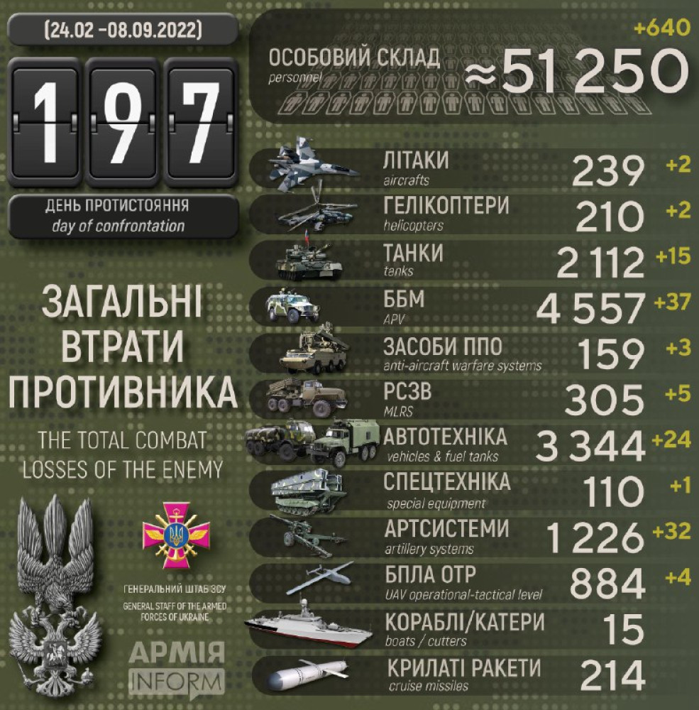 За минулу добу українські захисники знищили більше 600 окупантів, два ворожі літаки і два гелікоптери640 осіб, 15 танків і два гелікоптери втратили окупанти за минулу добу в Україні. Крім того, за даними Генерального штабу Збройних сил України, наші захисники також знищили 37 бойових броньованих машин, 32 артсистеми, п'ять РСЗВ, два літаки, три засоби ППО, чотири БПЛА оперативно-тактичного рівня, 24 одиниці автомобільної техніки і одну одиницю спецтехніки. Усього з початку повномасштабного вторгнення втрати ворога склали: особового складу — 51 250 осіб; танків ‒ 2112 одиниць; бойових броньованих машин ‒ 4557 одиниць; артилерійських систем – 1226 одиниць; РСЗВ – 305 одиниць; засоби ППО ‒ 159 одиниць; літаків – 239 одиниць; гелікоптерів– 210 одиниць; БПЛА оперативно-тактичного рівня – 884; крилаті ракети ‒ 214; кораблі /катери ‒ 15 одиниць; автомобільної техніки та автоцистерн – 3344 одиниці; спеціальна техніка ‒ 110. СМЕРТЬ РОСІЙСЬКИМ ОКУПАНТАМ! Помітили помилку? Виділяйте слова з помилкою та натискайте control-enter |