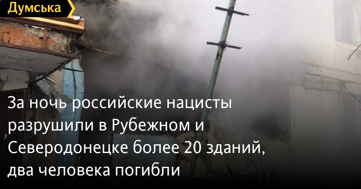 За ночь российские нацисты разрушили в Рубежном и Северодонецке более 20 зданий, два человека погиблиМинувшей ночью российские нацисты снова прицельно обстреливали артиллерией и системами залпового огня мирных жителей в Рубежном и Северодонецке Луганской области. Как сообщил глава военной администрации Луганской области Сергей Гайдай, в результате обстрелов разрушено более 20 жилых домов и объектов инфраструктуры. «Вечером враг обстрелял градами старые районы Северодонецка, в результате чего повреждено или разрушено шесть инфраструктурных объектов, два дома, гаражи. К сожалению, у нас уже есть двое погибших и четверо раненых», — отметил Гайдай. По его словам, в некоторых домах рядом с местами обстрелов нет газа и воды, местные службы стараются в кратчайшие сроки все починить. Гайдай добавил, что в Рубежном, который отбивается от врага из последних сил, тоже сложная ситуация. За ночь там загорелись десять домов и магазин. Два человека ранены. В 5 утра российские нацисты снова открывали огонь по Северодонецку, Кременной и Приволью. Информация о жертвах и разрушениях уточняется. СМЕРТЬ РОССИЙСКИМ ОККУПАНТАМ! Заметили ошибку? Выделяйте слова с ошибкой и нажимайте control-enter |