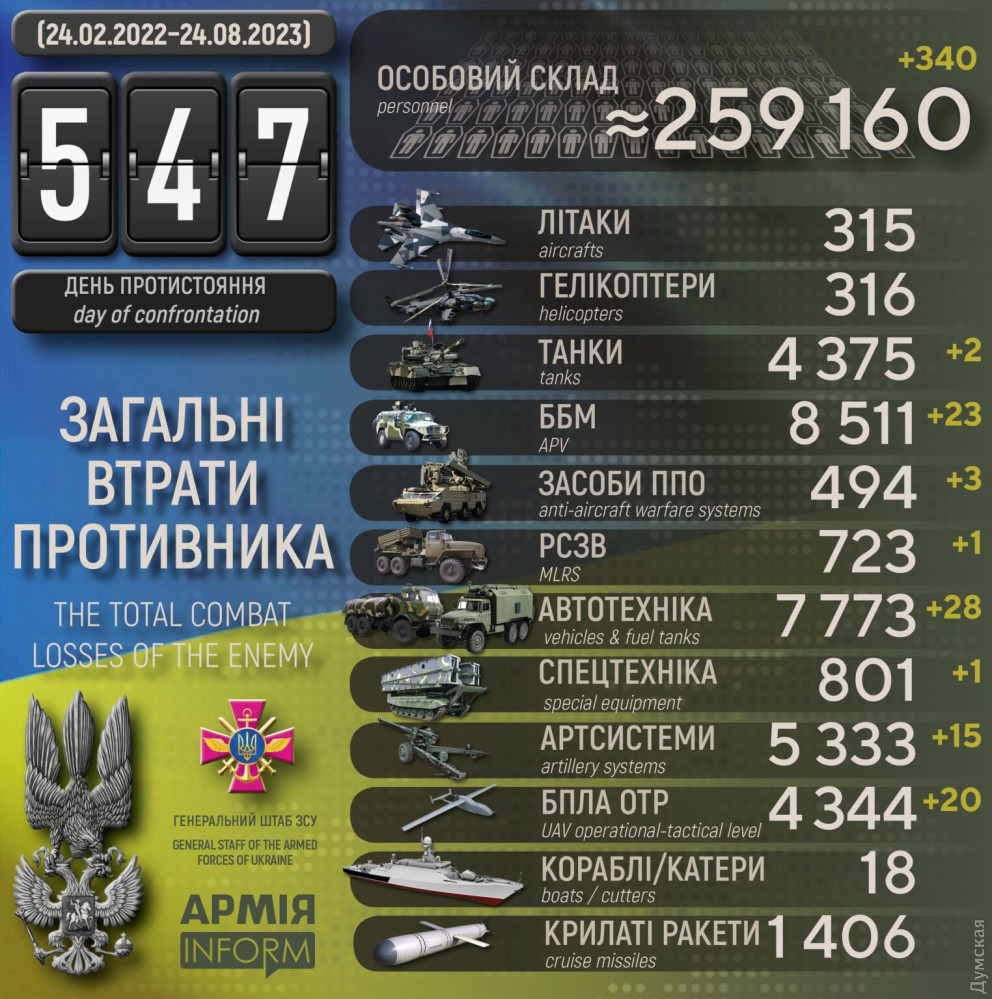 За півтора року великої війни Сили оборони знищили понад чверть мільйона окупантів, 340 лише за останню добуПонад чверть мільйона окупантів, з яких 340 за останню добу, втратила російська армія в Україні за минулу добу. За даними Генерального штабу Збройних сил України, наші захисники також знищили 15 артилерійських систем, 20 дронів оперативно-тактичного рівня, 2 танки, 23 бойові броньовані машини, 6 дронів оперативно-тактичного рівня, реактивну систему залпового вогню, 3 засоби ППО, 28 одиниць автомобільної техніки та одиницю спецтехніки. Загальні бойові втрати противника з 24.02.22 по 24.08.23 орієнтовно становлять: особового складу ‒ 259160 (+340) осіб ліквідовано танків ‒ 4375 (+2) бойових броньованих машин ‒ 8511 (+23) артилерійських систем ‒ 5333 (+15) РСЗВ ‒ 723 (+1) засоби ППО ‒ 494 (+3) літаків ‒ 315 (0) гелікоптерів ‒ 316 (0) БПЛА оперативно-тактичного рівня ‒ 4344 (+20) крилаті ракети ‒ 1406 (0) кораблі / катери ‒ 18 (0) автомобільної техніки та автоцистерн ‒ 7773 (+28) спеціальна техніка ‒ 801 (+1) СМЕРТЬ РОСІЙСЬКИМ ОКУПАНТАМ! Помітили помилку? Виділяйте слова з помилкою та натискайте control-enter |