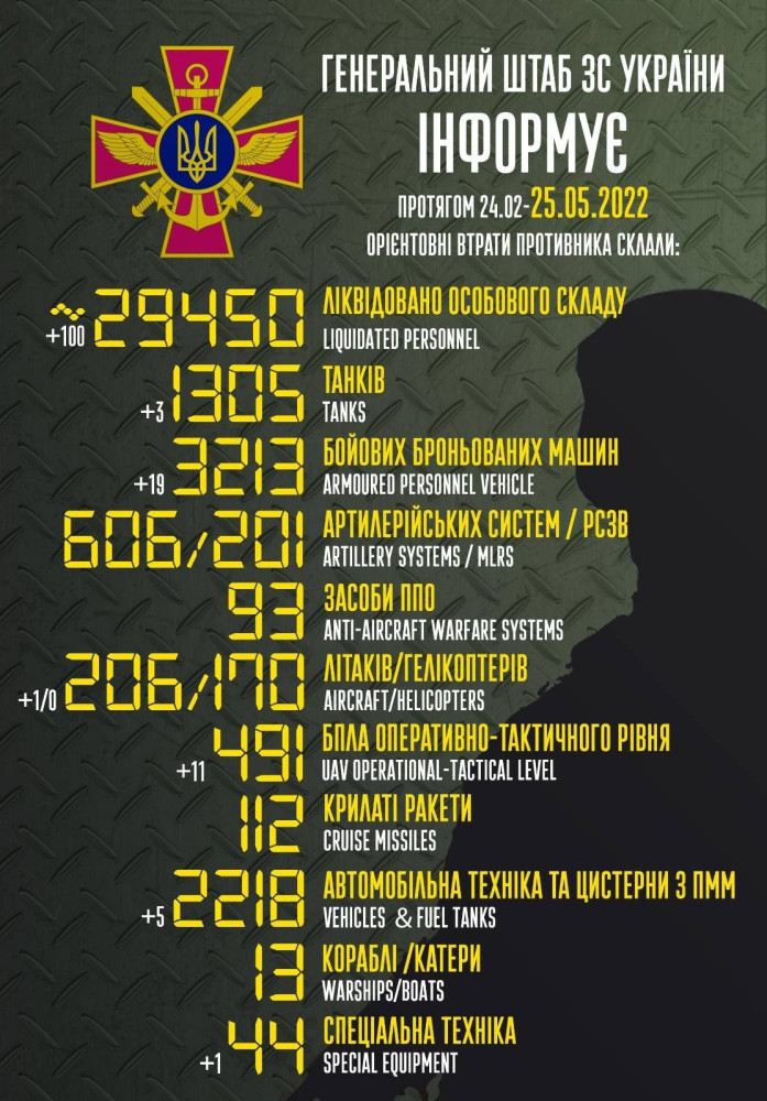 За прошедшие сутки оккупанты потеряли в Украине сто человек, один самолет и 19 боевых бронированных машинСто солдат, три танка и один самолет потеряли российские нацисты за минувшие сутки в Украине. Кроме того, как сообщает Генштаб Вооруженных сил, украинские защитники уничтожили 19 боевых бронированных машин, 11 БПЛА оперативно-тактического уровня, пять единиц автомобильной техники и одну единицу спецтехники. Всего с начала полномасштабного вторжения потери врага составили: личного состава — 29 450 человек; танков ‒ 1305 единиц; боевых бронированных машин ‒ 3213 единиц; артиллерийских систем – 606 единиц; РСЗО — 201 единицу; средства ПВО - 93 единицы; самолетов – 206 единиц; вертолетов – 170 единиц; БПЛА оперативно-тактического уровня – 491; крылатые ракеты — 112; корабли/катера — 13 единиц; автомобильной техники и автоцистерн — 2217 единиц; специальная техника – 44. СМЕРТЬ РОСІЙСЬКИМ ОКУПАНТАМ! Помітили помилку? Виділяйте слова з помилкою та натискайте control-enter |