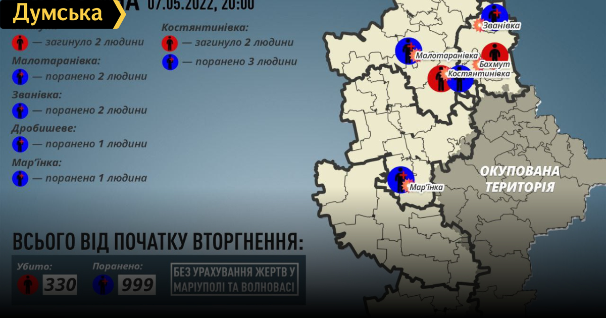 Четыре мирных жителя Донецкой области погибли в результате вражеских обстрелов 7 мая. Еще девять человек получили ранения. Как сообщил глава Донецкой ОВА Павел Кириленко, два человека погибли в Бахмуте и двое в Константиновке. Число погибших в Мариуполе и Волновахе на данный момент установить невозможно. СМЕРТЬ РОСІЙСЬКИМ ОКУПАНТАМ! Помітили помилку? Виділяйте слова з помилкою та натискайте control-enter |