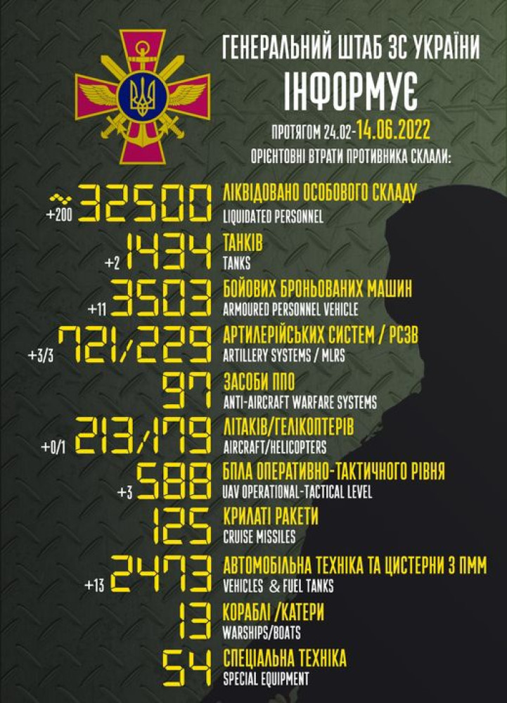 За сутки российские нацисты потеряли в Украине 200 человек, один вертолет и три БПЛА200 солдат, один вертолет и два танка потеряли российские нацисты за минувшие сутки в Украине. Кроме того, как сообщает Генштаб Вооруженных сил, украинские защитники уничтожили 11 боевых бронированных машин, три артиллерийские системы, три РСЗО, три БПЛА оперативно-тактического уровня и 13 единиц автомобильной техники. Всего с начала полномасштабного вторжения потери врага составили: личного состава — 32 500 человек; танков 1434 единицы; боевых бронированных машин 3503 единицы; артиллерийских систем – 721 единицу; РСЗО — 229 единиц; средства ПВО - 97 единиц; самолетов – 213 единиц; вертолетов – 179 единиц; БПЛА оперативно-тактического уровня – 588; крылатые ракеты — 125; корабли/катера — 13 единиц; автомобильной техники и автоцистерн — 2473 единицы; специальная техника – 54. СМЕРТЬ РОСІЙСЬКИМ ОКУПАНТАМ! Помітили помилку? Виділяйте слова з помилкою та натискайте control-enter |