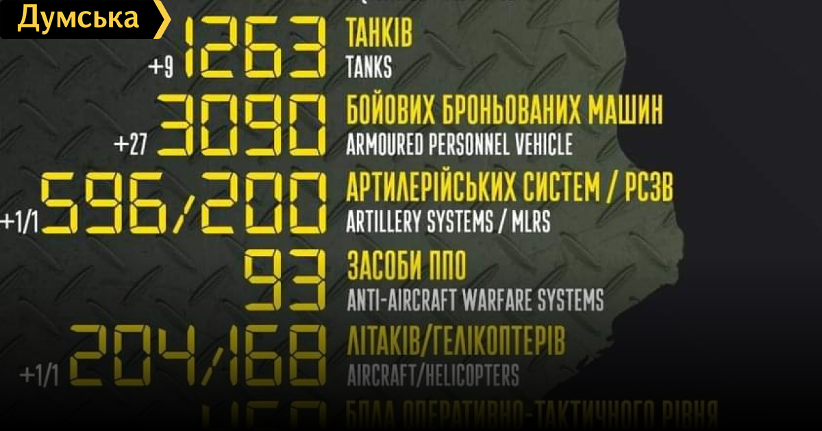 За сутки российские оккупанты потеряли в Украине 200 человек, один вертолет и девять танков200 солдат, девять танков и один вертолет потеряли российские нацисты за минувшие сутки в Украине. Кроме того, как сообщает Генштаб Вооруженных сил, украинские защитники уничтожили 27 боевых бронированных машин, одну артиллерийскую систему, одну РСЗО, один самолет, один вертолет, пять БПЛА оперативно-тактического уровня и пять единиц автомобильной техники. Всего с начала полномасштабного вторжения потери врага составили: личного состава — 28 700 человек; танков — 1263 единицы; боевых бронированных машин 3090 единиц; артиллерийских систем – 596 единиц; РСЗО — 200 единиц; средства ПВО - 93 единицы; самолетов – 204 единицы; вертолетов – 168 единиц; БПЛА оперативно-тактического уровня – 460; крылатые ракеты — 103; корабли/катера — 13 единиц; автомобильной техники и автоцистерн — 2162 единицы; специальная техника – 43. СМЕРТЬ РОСІЙСЬКИМ ОКУПАНТАМ! Помітили помилку? Виділяйте слова з помилкою та натискайте control-enter |