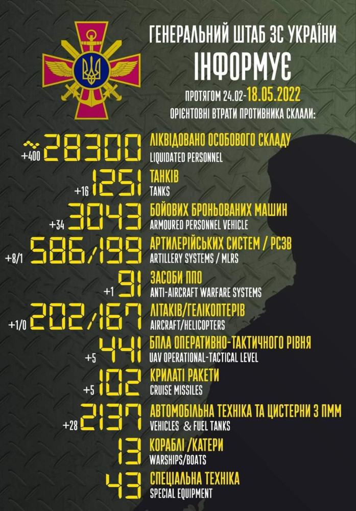 За сутки российские оккупанты потеряли в Украине16 танков, один самолет и восемь артсистем400 солдат, 16 танков и один самолет потеряли российские нацисты за минувшие сутки в Украине. Кроме того, как сообщает Генштаб Вооруженных сил, украинские защитники уничтожили 34 боевые бронированные машины, восемь артиллерийских систем, одну реактивную систему залпового огня, одно средство ПВО, пять беспилотников оперативно-тактического уровня, столько же крылатых ракет и 28 единиц автомобильной техники. Всего с начала полномасштабного вторжения потери врага составили: личного состава — 28 300 человек; танков — 1251 единиц; боевых бронированных машин ‒ 3043 единицы; артиллерийских систем – 586 единиц; РСЗО — 199 единиц; средства ПВО - 91 единиц; самолетов – 202 единицы; вертолетов – 167 единиц; БПЛА оперативно-тактического уровня – 441; крылатые ракеты — 102; корабли/катера — 13 единиц; автомобильной техники и автоцистерн — 2137 единицу; специальная техника – 43. За минувшие сутки наибольшие потери наблюдались на славянском, криворожском и запорожском направлениях. СМЕРТЬ РОСІЙСЬКИМ ОКУПАНТАМ! Помітили помилку? Виділяйте слова з помилкою та натискайте control-enter |