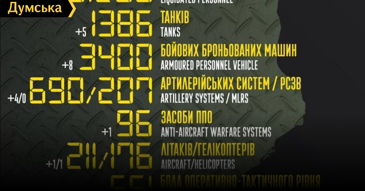 За сутки российские оккупанты потеряли в Украине сто человек, три крылатые ракеты и самолетСто солдат, один вертолет и пять танков потеряли российские нацисты за минувшие сутки в Украине. Кроме того, как сообщает Генштаб Вооруженных сил, украинские защитники уничтожили восемь боевых бронированных машин, четыре артиллерийские системы, одно средство ПВО, один вертолет, три БПЛА оперативно-тактического уровня, 35 единиц автомобильной техники и три крылатые ракеты. Всего с начала полномасштабного вторжения потери врага составили: личного состава — 31 250 человек; танков — 1386 единиц; боевых бронированных машин ‒ 3400 единиц; артиллерийских систем – 690 единиц; РСЗО — 207 единиц; средства ПВО - 96 единиц; самолетов – 211 единиц; вертолетов – 176 единиц; БПЛА оперативно-тактического уровня – 551; крылатые ракеты – 125; корабли/катера — 13 единиц; автомобильной техники и автоцистерн — 2395 единиц; специальная техника – 53. СМЕРТЬ РОСІЙСЬКИМ ОКУПАНТАМ! Помітили помилку? Виділяйте слова з помилкою та натискайте control-enter |