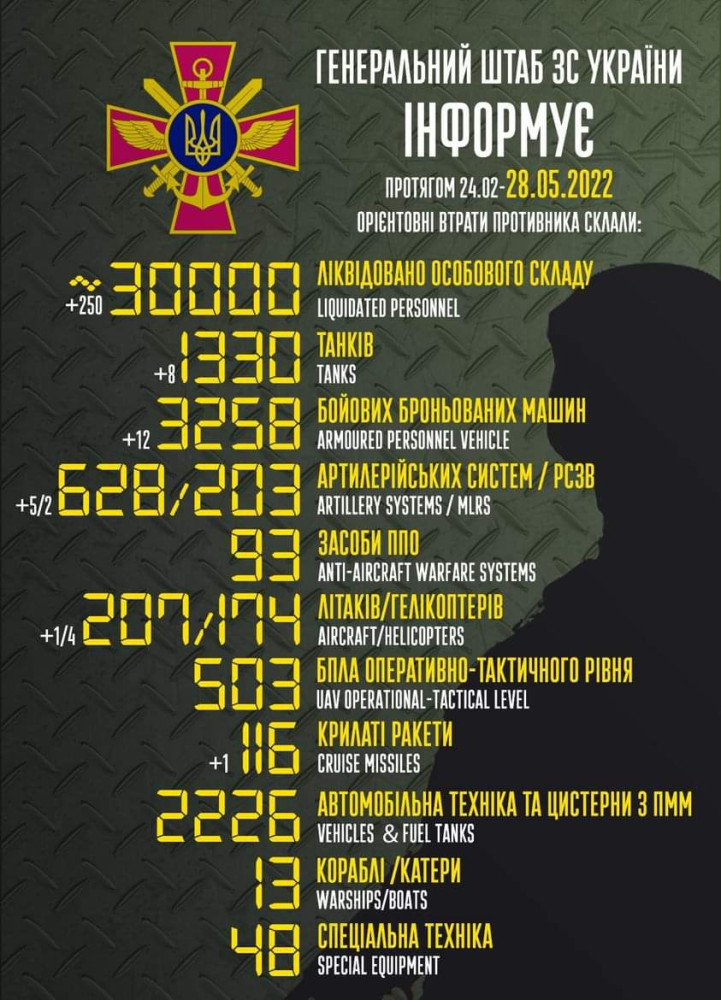 С начала полномасштабного вторжения 30 тысяч оккупантов убиты или взяты в плен. За последние сутки враг потерял 250 солдат, восемь танков и четыре вертолета.