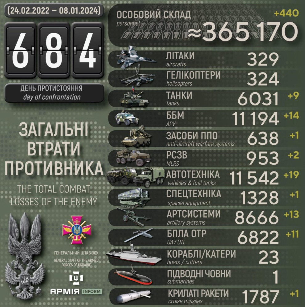 За добу Сили оборони знищили 13 ворожих артсистем, дев`ять танків та понад 400 окупантів440 осіб, одну крилату ракету та дев'ять танків втратили російські окупанти минулої доби. Крім того, за даними Генерального штабу Збройних сил України, наші захисники також знищили 14 бойових броньованих машин, 13 артсистем, дві РСЗВ, один засіб ППО, 11 БПЛА оперативно-тактичного рівня, 19 одиниць автомобільної техніки та одну одиницю спецтехніки. Усього з початку повномасштабного вторгнення втрати ворога склали: особового складу — 365 170 осіб; танків ‒ 6031 одиницю; бойових броньованих машин ‒ 11194 одиниці; артилерійських систем – 8666 одиниць; РСЗВ – 953 одиниці; засоби ППО ‒ 638 одиниць; літаків – 329 одиниць; гелікоптерів – 324 одиниці; БПЛА оперативно-тактичного рівня – 6822; крилаті ракети ‒ 1787; кораблі /катери ‒ 23 одиниці; підводні човни — 1 одиницю; автомобільної техніки та автоцистерн – 11542 одиниці; спеціальна техніка ‒ 1328. СМЕРТЬ РОСІЙСЬКИМ ОКУПАНТАМ! Помітили помилку? Виділяйте слова з помилкою та натискайте control-enter |