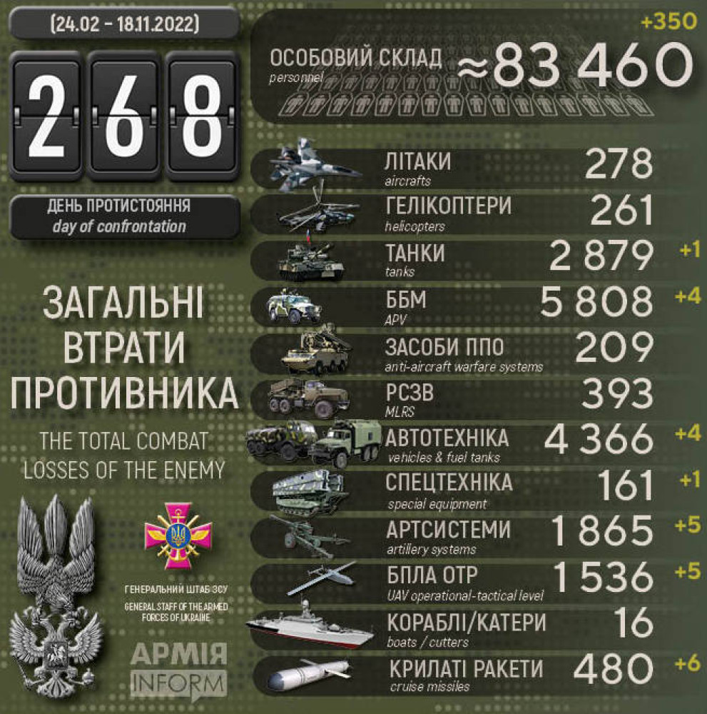 За добу українські захисники знищили 350 окупантів, шість ворожих ракет і п`ять артсистем350 осіб, шість крилатих ракет і п'ять артсистем втратили окупанти в Україні за минулу добу. Крім того, за даними Генерального штабу Збройних сил України, наші захисники також знищили один танк, чотири бойові броньовані машини, п'ять БПЛА оперативно-тактичного рівня, чотири одиниці автомобільної техніки і одну одиницю спецтехніки. Усього з початку повномасштабного вторгнення втрати ворога склали: особового складу — 83 460 осіб; танків ‒ 2879 одиниць; бойових броньованих машин ‒ 5808 одиниць; артилерійських систем – 1865 одиниць; РСЗВ – 393 одиниці; засоби ППО ‒ 209 одиниць; літаків – 278 одиниць; гелікоптерів – 261 одиницю; БПЛА оперативно-тактичного рівня – 1536; крилаті ракети ‒ 480; кораблі /катери ‒ 16 одиниць; автомобільної техніки та автоцистерн – 4366 одиниць; спеціальна техніка ‒ 161. СМЕРТЬ РОСІЙСЬКИМ ОКУПАНТАМ! Помітили помилку? Виділяйте слова з помилкою та натискайте control-enter |